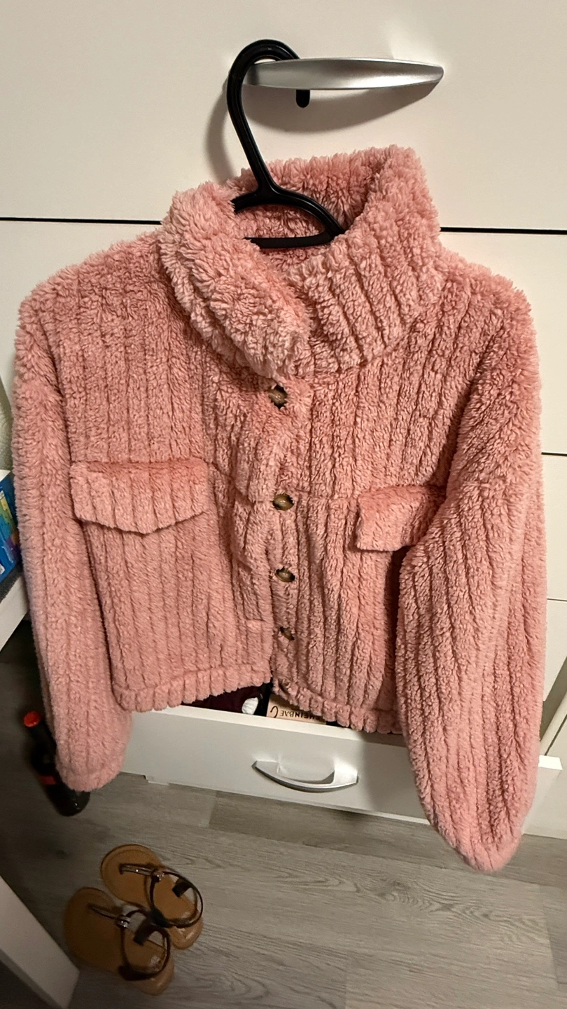 This is a super cozy pink fuzzy jacket! It's in great condition and perfect for layering on chilly days. The material is soft and plush, making it a really comfortable piece to wear. It features a collared neck and button-up front with two front pockets. It's a stylish and warm addition to any wardrobe!