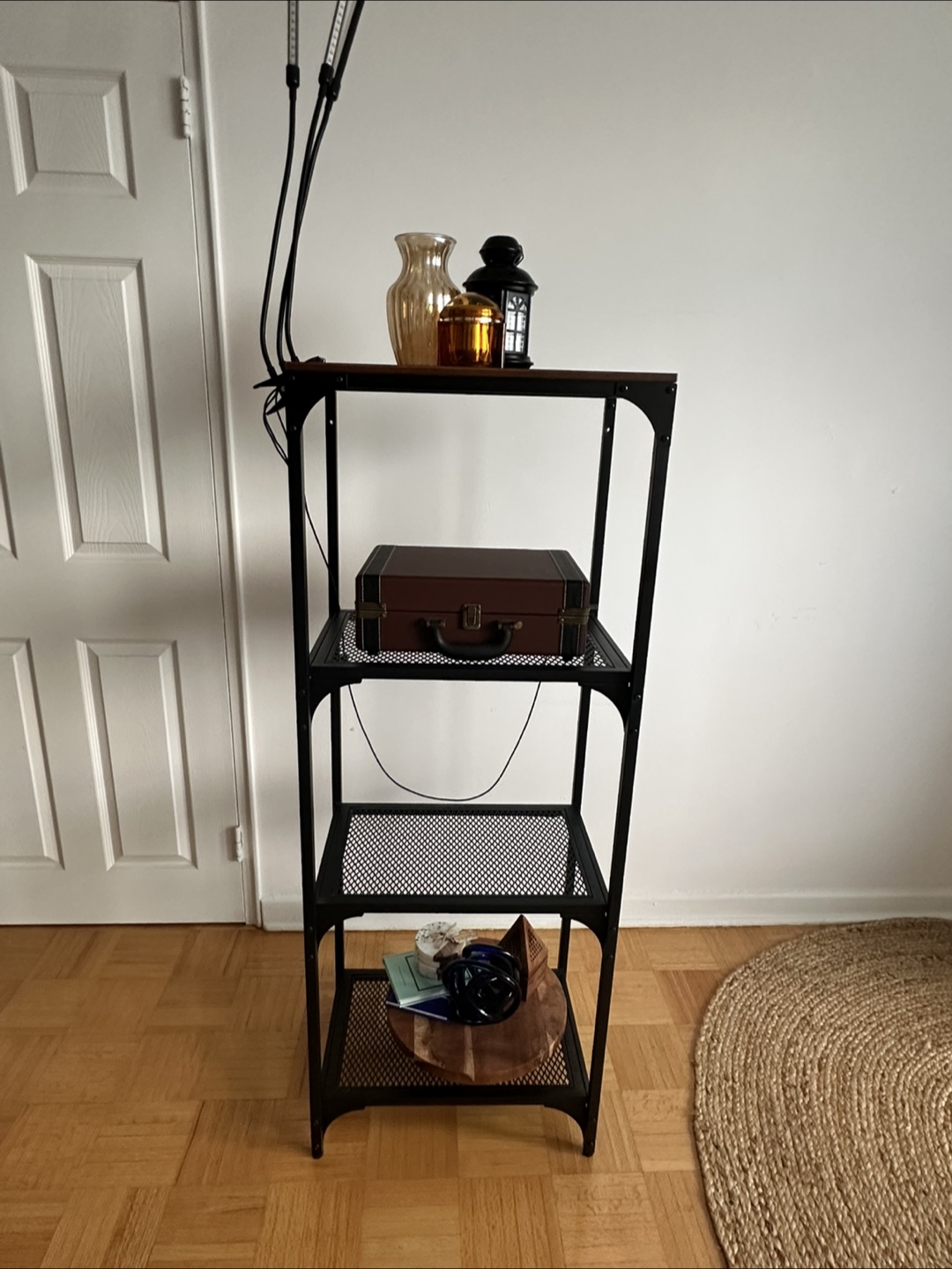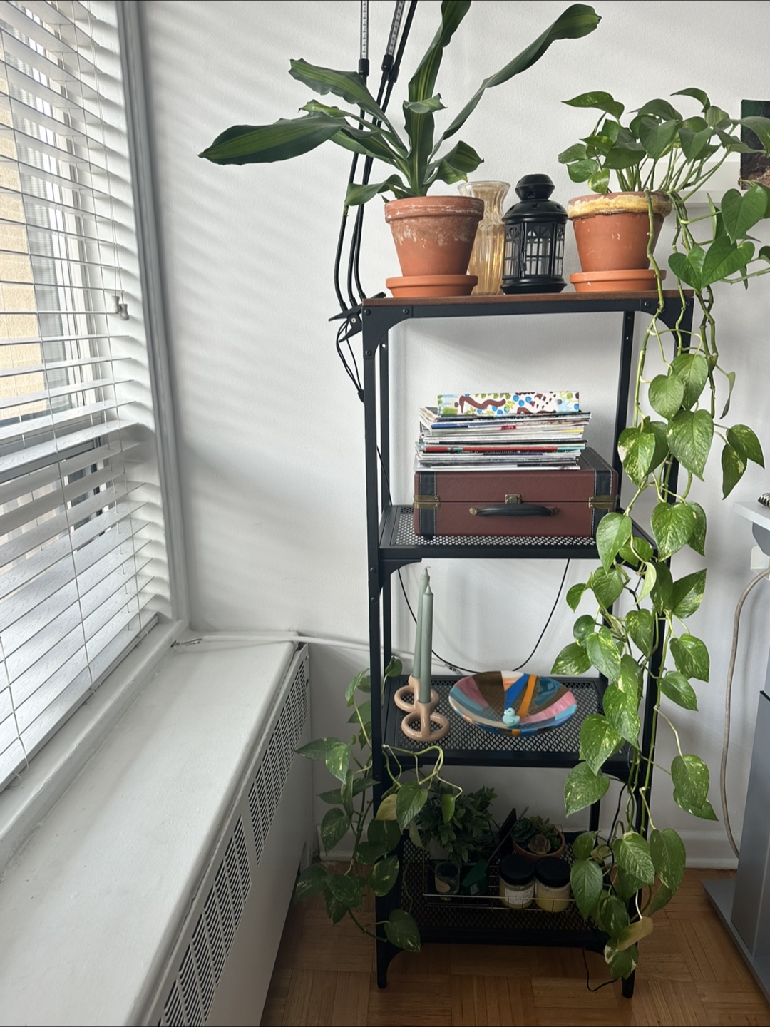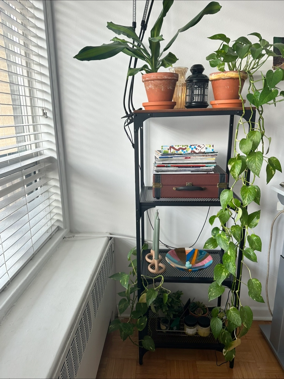 Industrial-style shelving unit in perfect condition. 4-shelves. Great for storage, as a plant stand or as a bookcase.