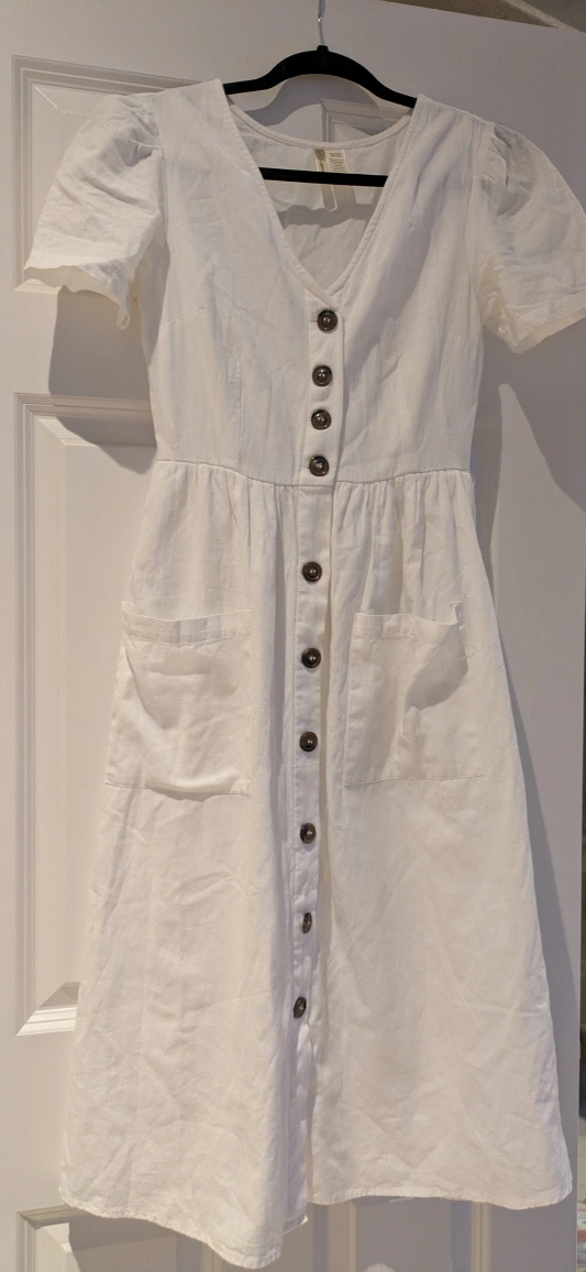 A cute white dress with a button-down front and pockets! It's in great condition and ready for a new home. Pick up @ midtown or downtown🤗
