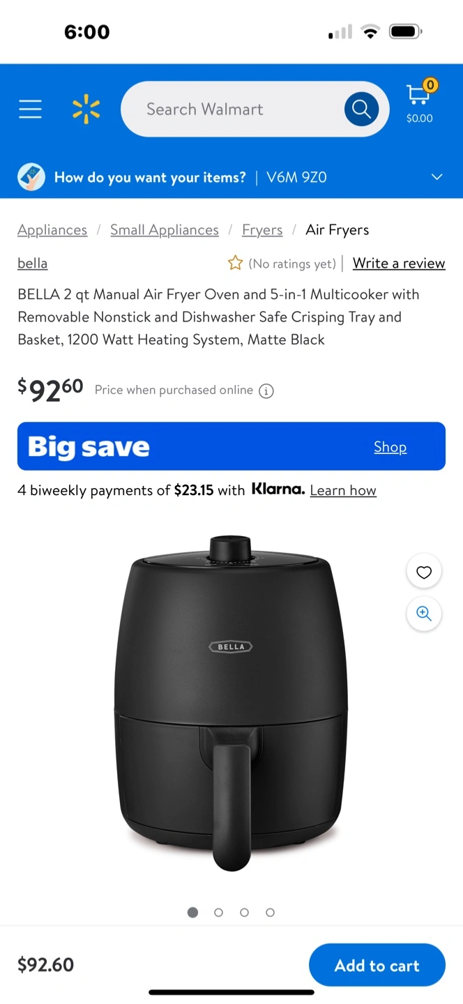 Selling a Bella 2 qt manual air fryer oven and 5-in-1 multicooker! It comes with a removable nonstick and dishwasher-safe crisping tray and basket, plus a 1200-watt heating system. The colour is matte black. Originally bought for $92.60