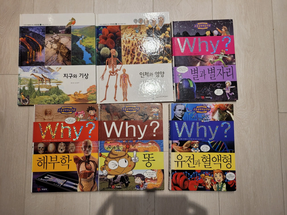 $4 for all 6 books. I'm selling a set of Why? 초등과학학습만화 comic books. The titles include 지구와 기상 (Earth and Weather), 인체와 영양 (Human Body and Nutrition), 별과 별자리 (Stars and Constellations), 해부학 (Anatomy), 똥 (Poop), and 유전과 혈액형 (Genetics and Blood Type).
