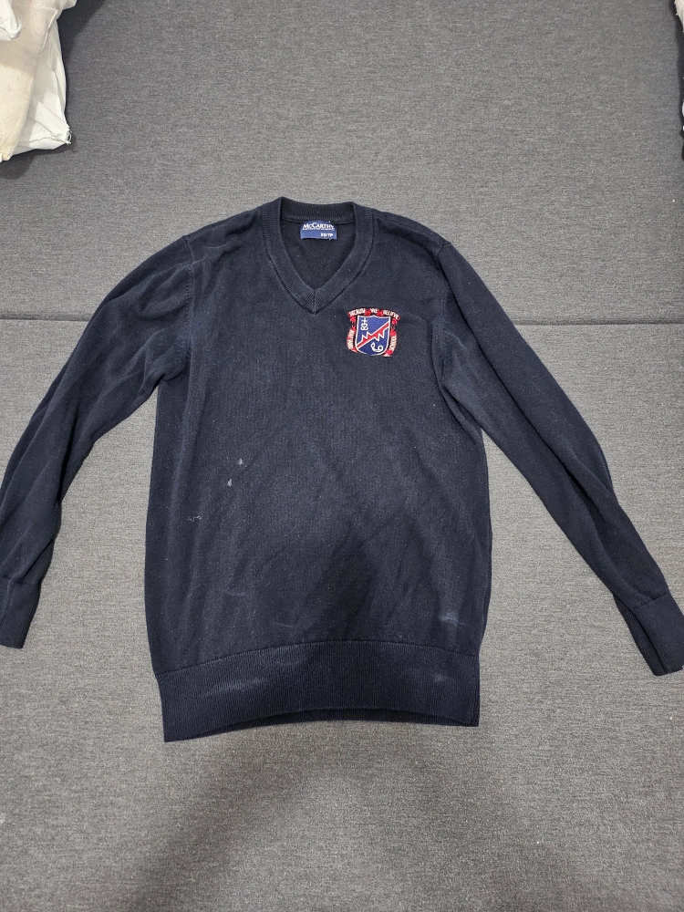 Selling a McCarthy uniform sweater in size XS/TP. It's a navy blue colour and has the school crest on the chest. There are some signs of wear, as pictured.