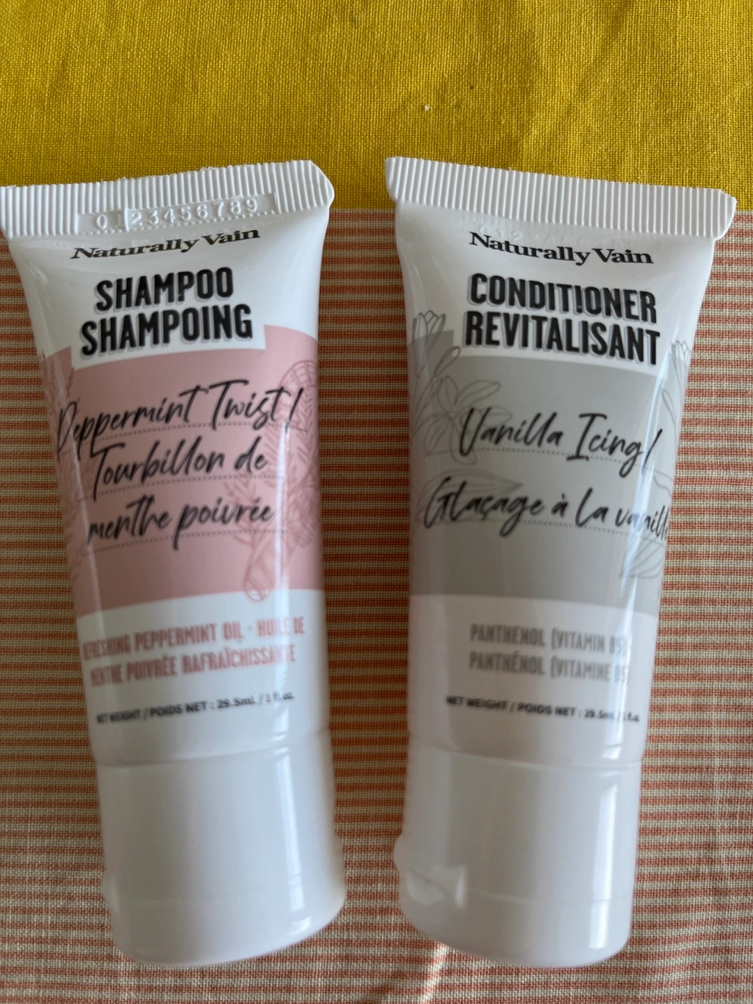 Selling a set of Naturally Vain shampoo and conditioner! The shampoo is Peppermint Twist and the conditioner is Vanilla Icing. Each bottle contains 29.5ml. Both small tubes are good for travel.