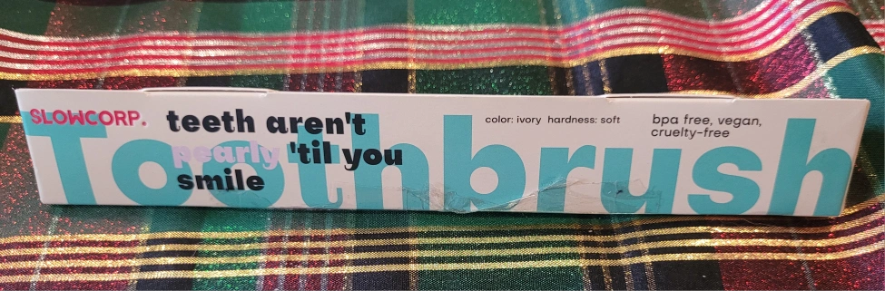 - A Slowcorp toothbrush in ivory, with soft hardness. It's BPA free, vegan, and cruelty-free