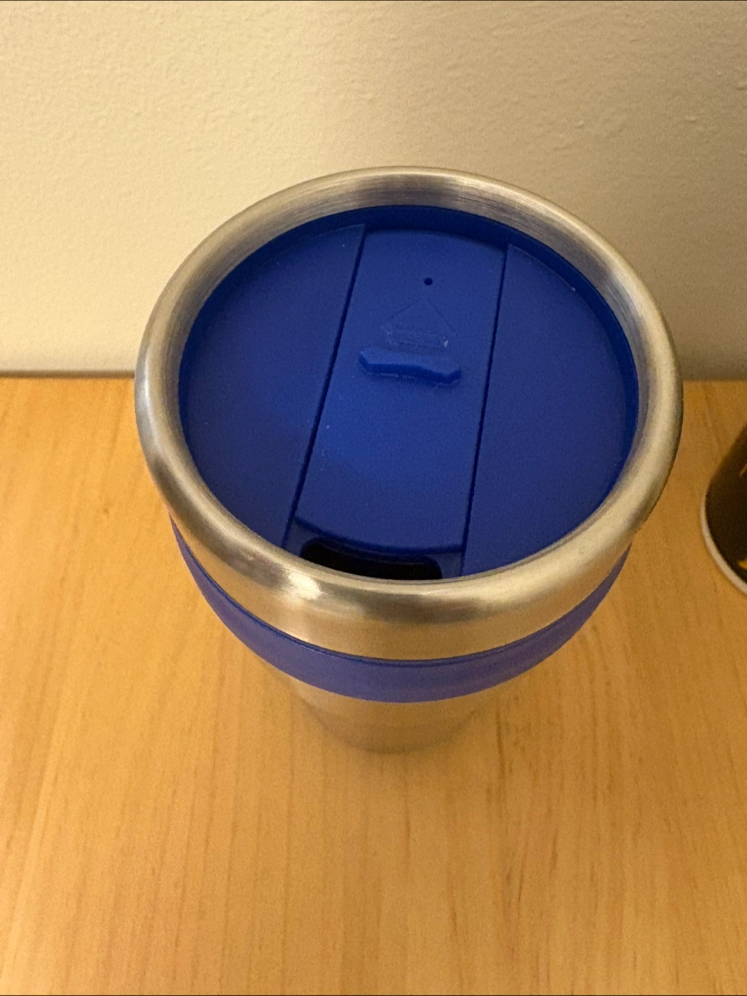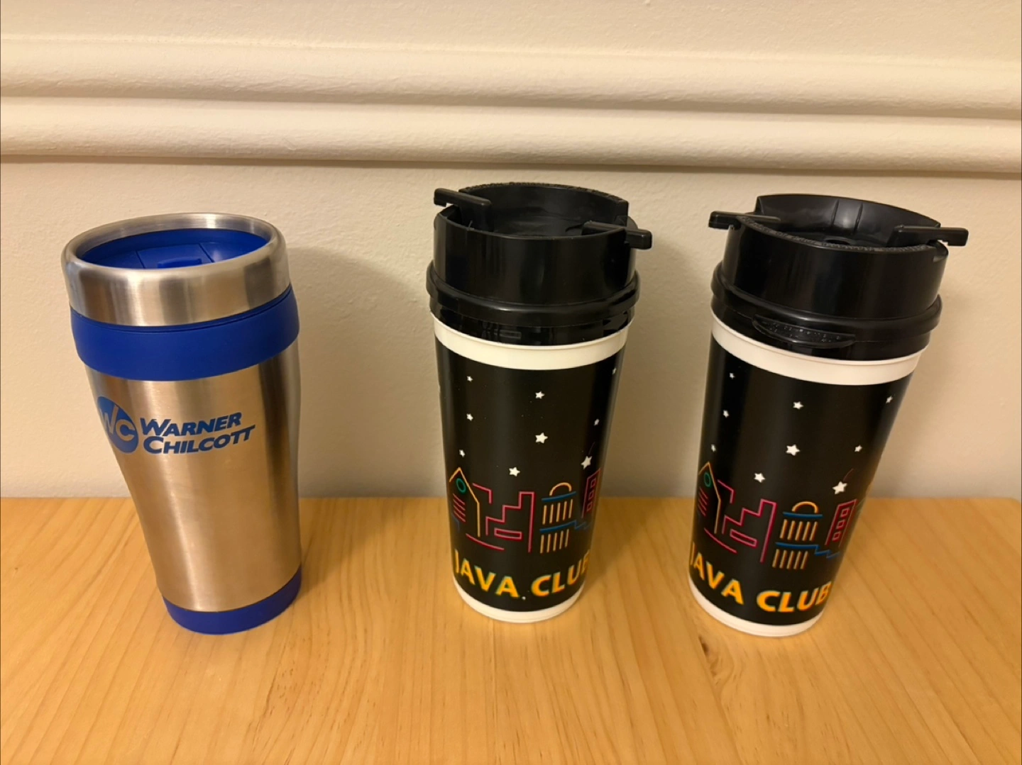 Selling a set of travel mugs! One is a stainless steel travel mug with the Warner Chilcott logo, and the other two are Java Club travel mugs with a fun city skyline design. They're great for keeping your coffee or tea warm on the go