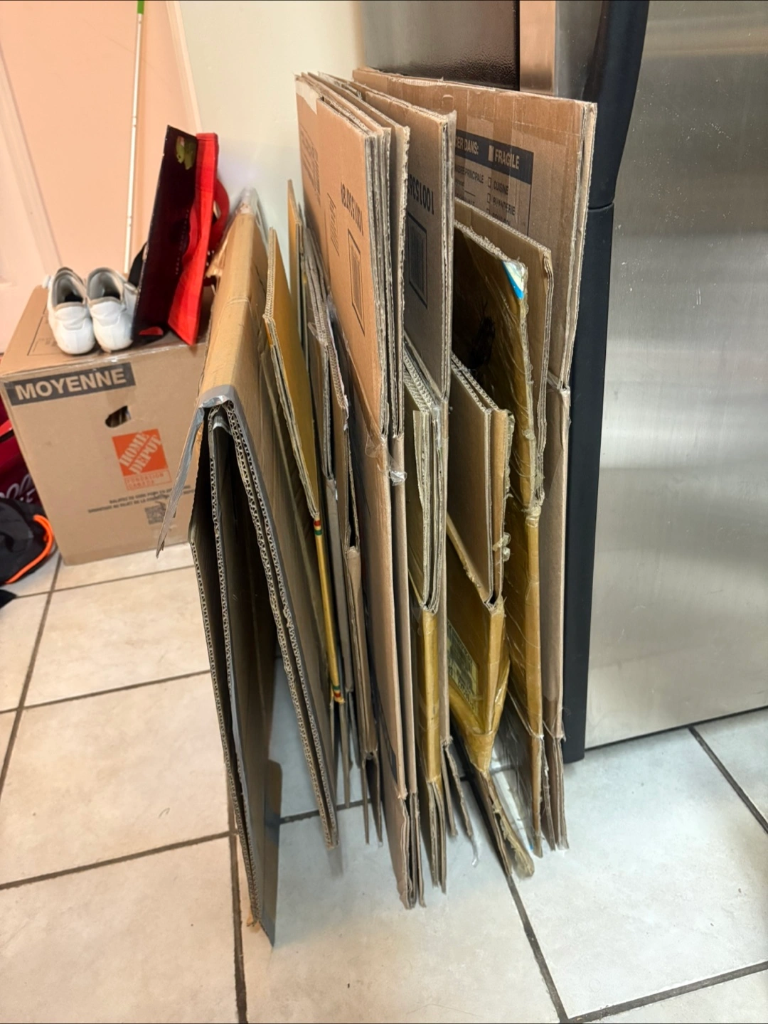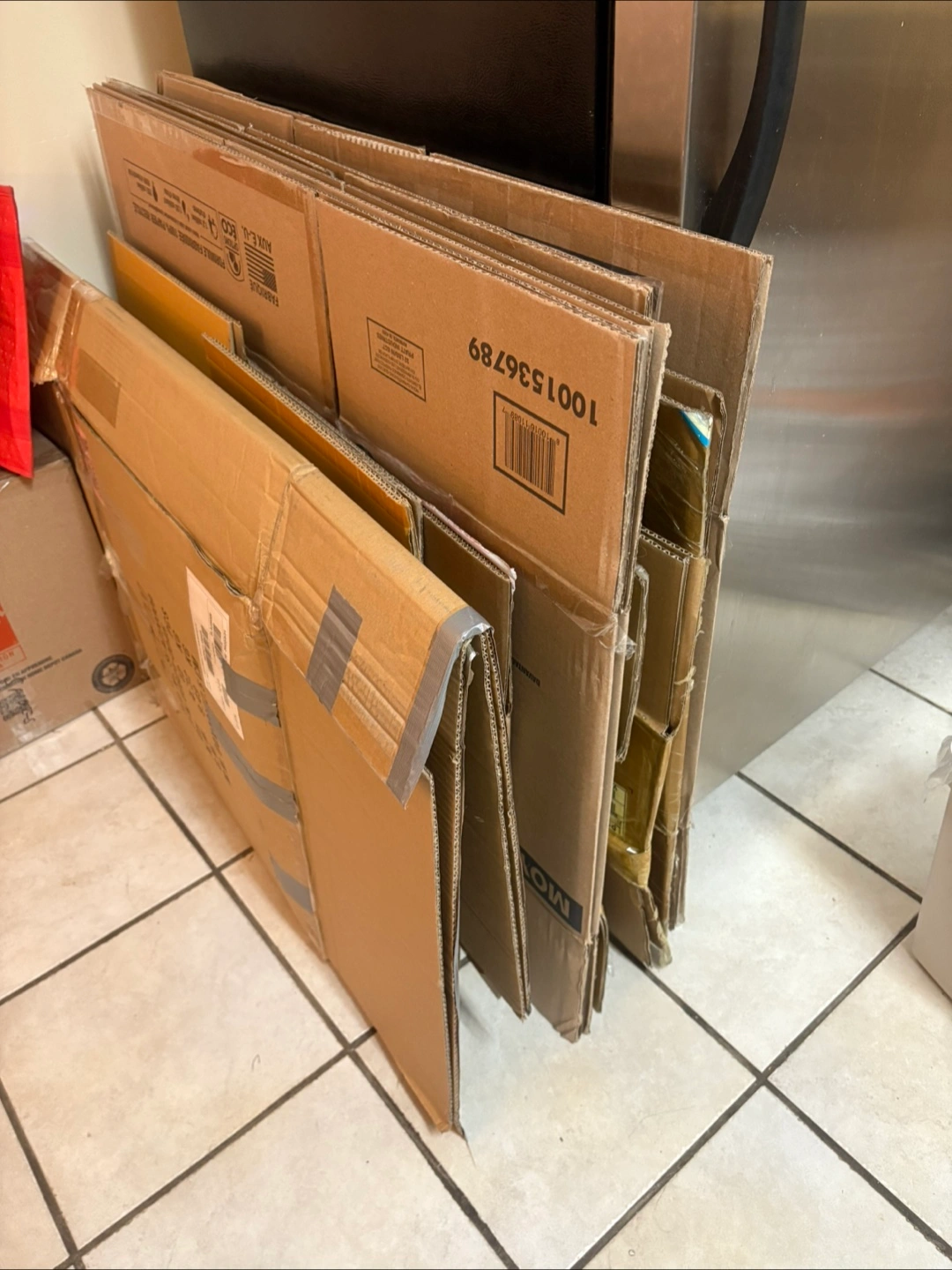 Selling a stack of used cardboard boxes for moving in and out.