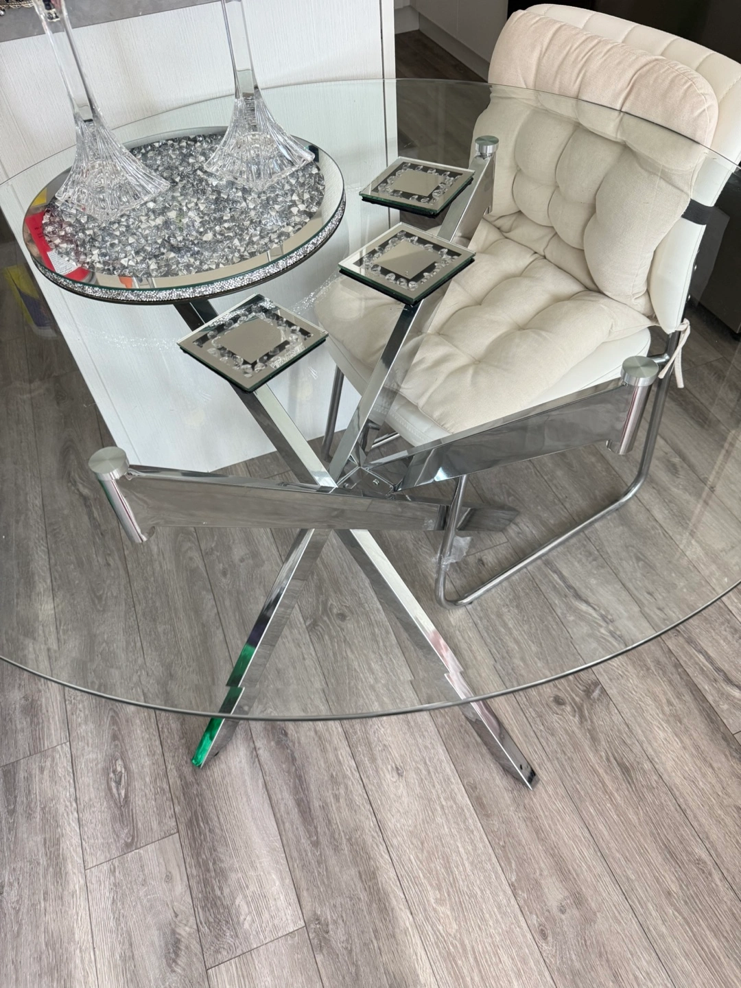 Selling a stylish round glass dining table with unique chrome legs! The table features a clear glass top and a modern design that would look great in any dining area. The legs are made of chrome, adding a touch of elegance to the piece.