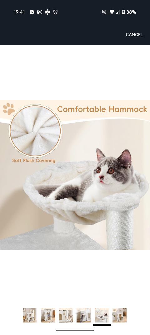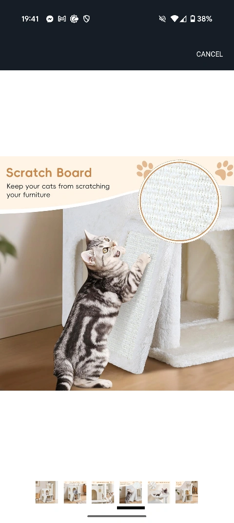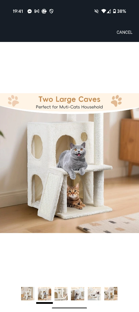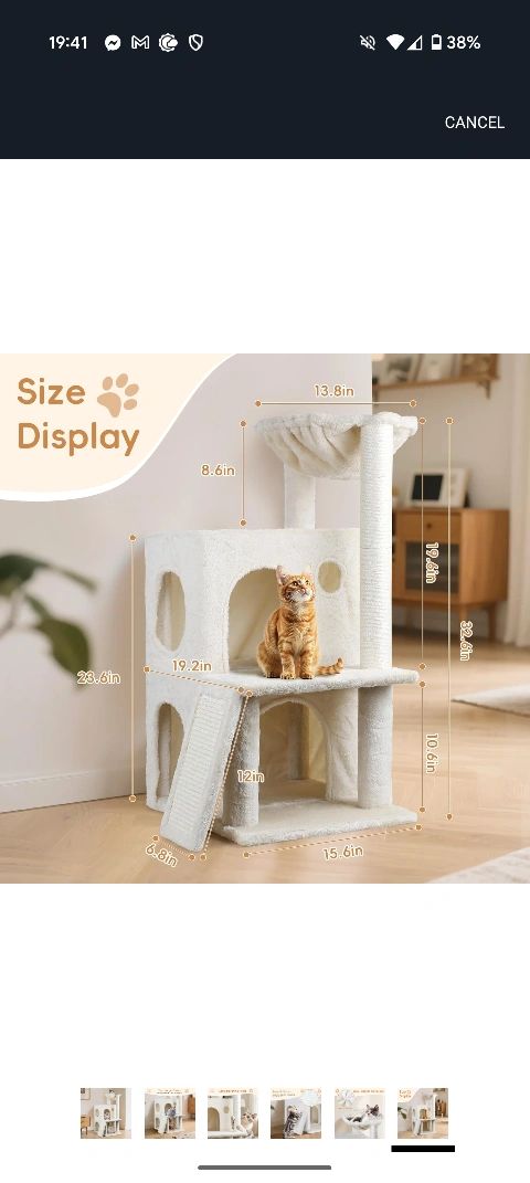 Give your furry friends the purr-fect place to play and relax with this cat tree! It features a comfy hammock, two large caves for hiding, and a scratch board to keep your cat from scratching your furniture. The soft plush covering makes it extra cozy. Dimensions: 13.8in x 8.6in x 19.6in x 28.6in x 6.8in x 15.6in x 12in x 10.6in