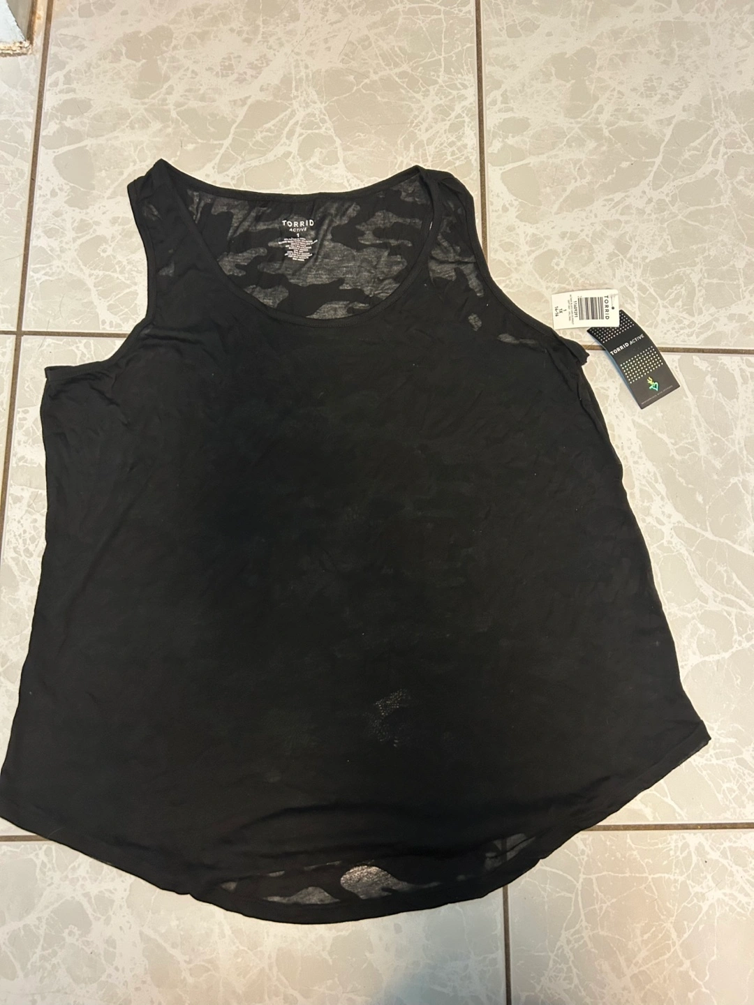 Selling a Torrid Active tank top in black camo burnout pattern! It's a size 1X, which fits sizes 14-16. The material is 65% polyester and 35% rayon, making it lightweight and comfy. Perfect for workouts or casual wear!