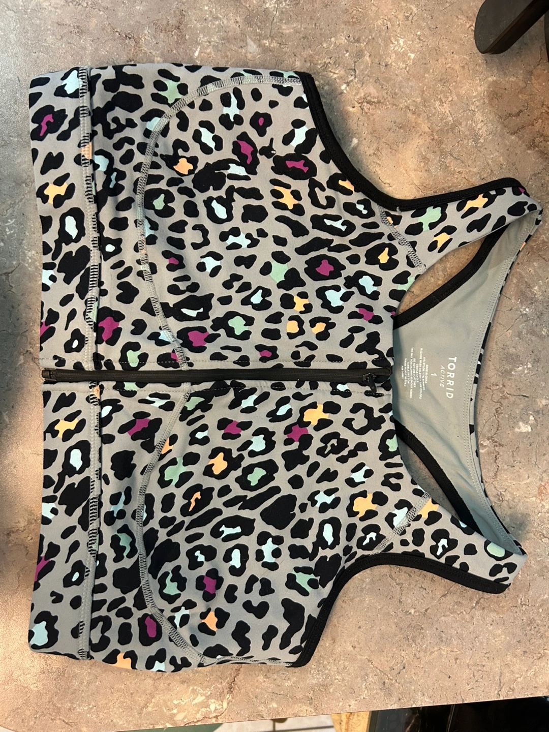Selling a Torrid Active bra in a fun leopard print! It's a size 1 and made of 93% nylon and 7% spandex
