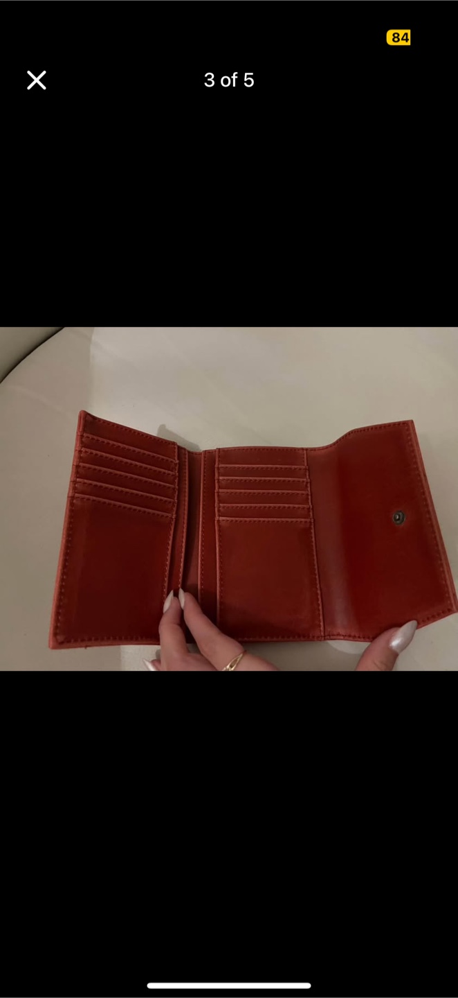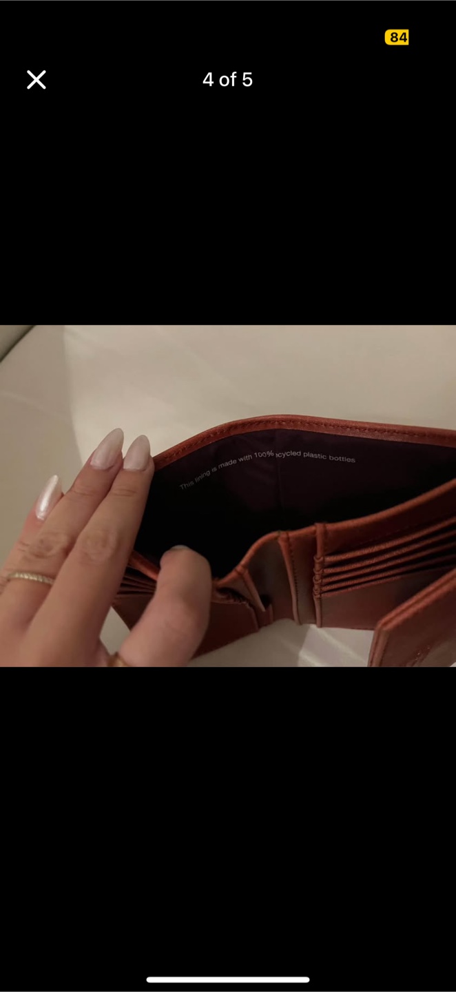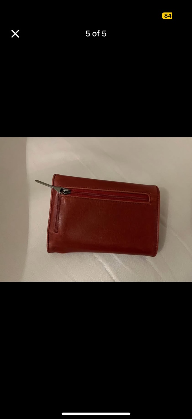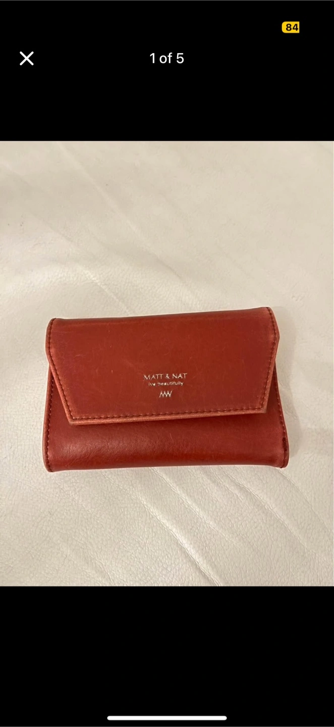 Selling a cute Matt & Nat wallet in a lovely red colour! It's a trifold style and has a zipper compartment in the back. The lining is made with 100% recycled plastic bottles.