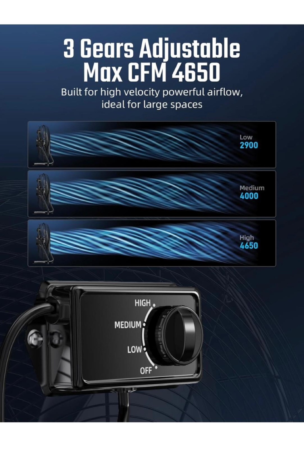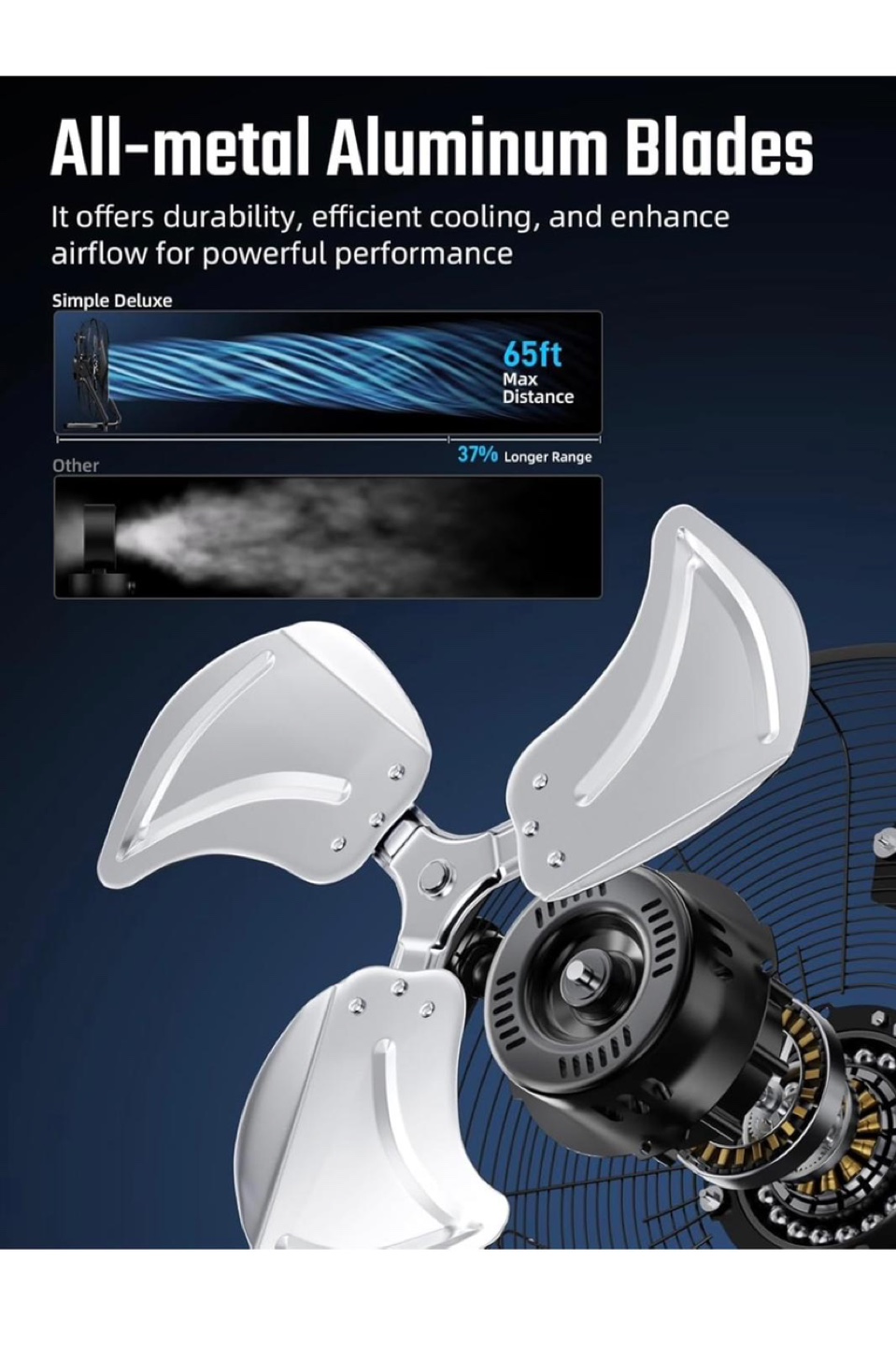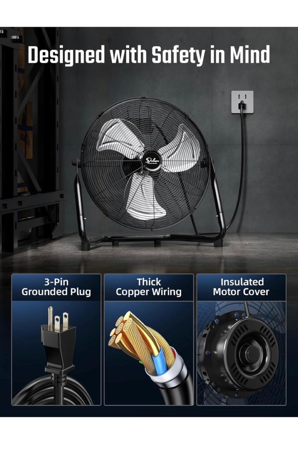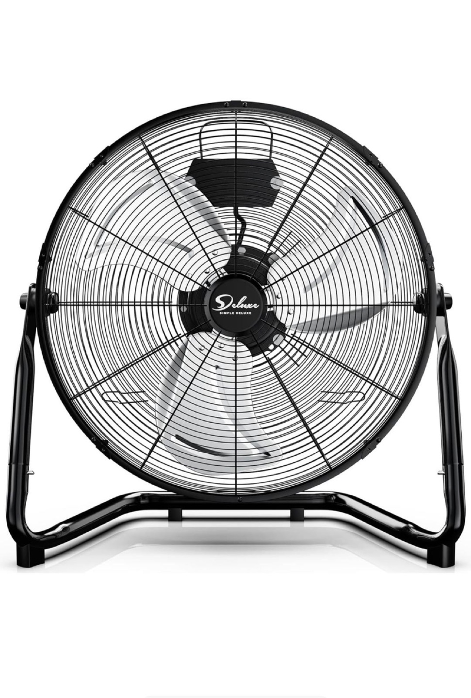 Keep cool with this Simple Deluxe 20-inch floor fan! It features all-metal aluminum blades for durability and efficient cooling. The fan is designed with safety in mind, including a 3-pin grounded plug and insulated motor cover. You can adjust the airflow with three different gear settings, reaching a max CFM of 4650