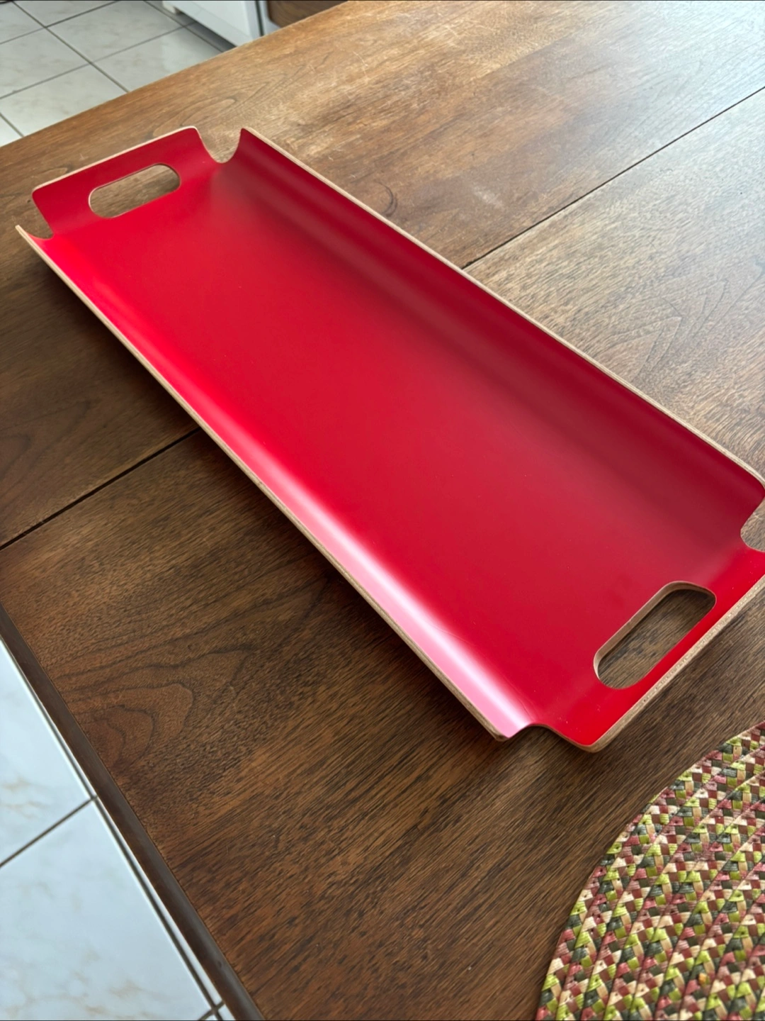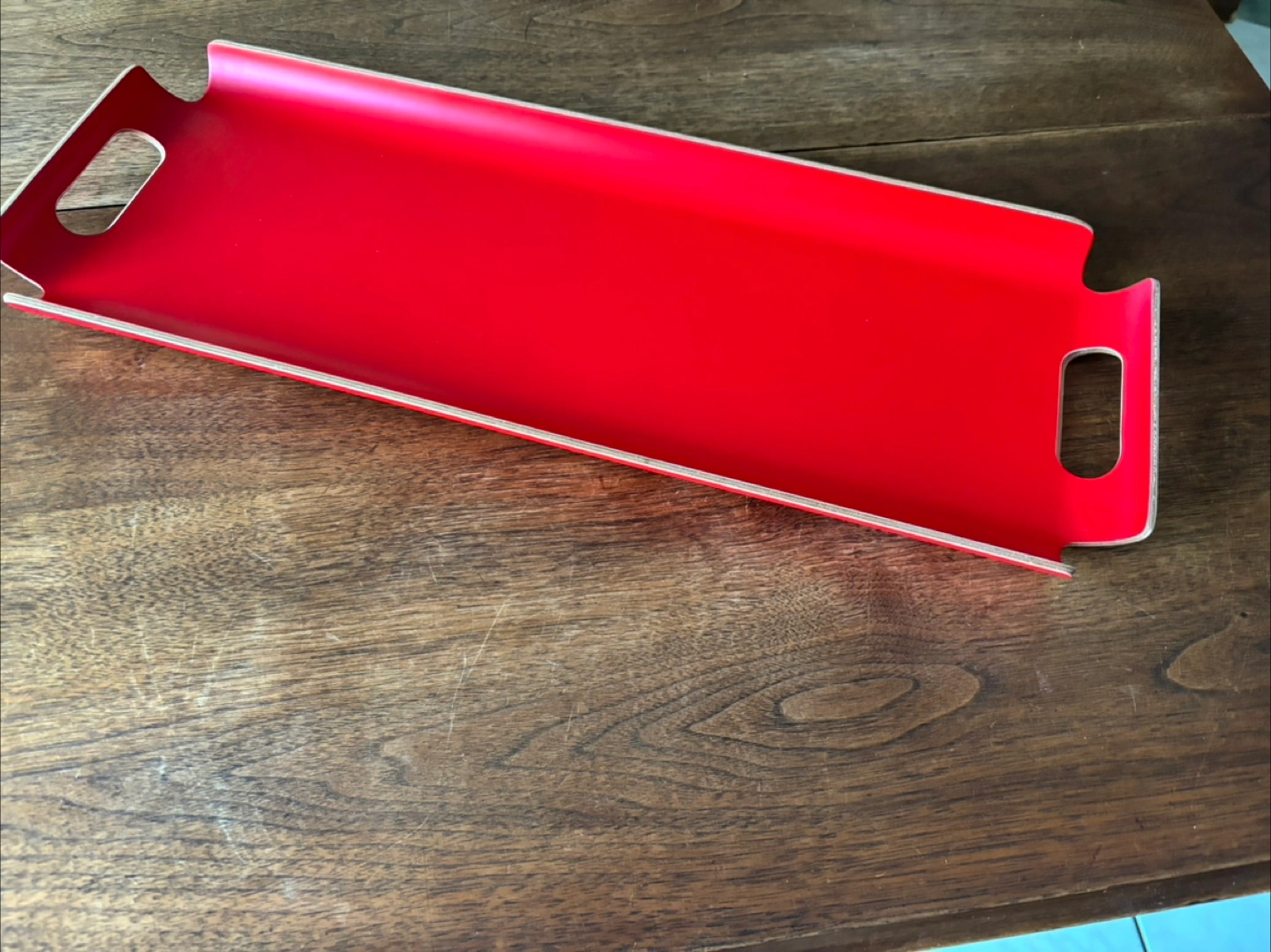 Here's a bright red serving tray! It has a sleek design with convenient handles on each end. Perfect for serving snacks or drinks to your guests, or just adding a pop of colour to your home decor. 22” by 8.5”. Cash only.