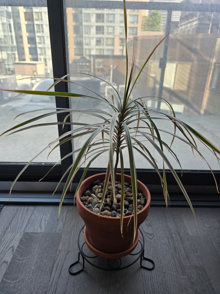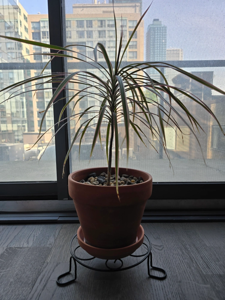 Selling a healthy Dracaena Marginata plant in a terracotta pot! It's a great way to add some greenery to your home or office. The plant comes with a decorative metal stand and is topped with small pebbles. Easy to care for and adds a touch of nature to any space