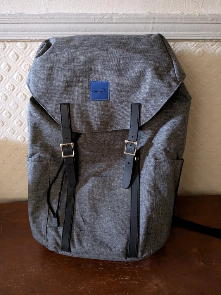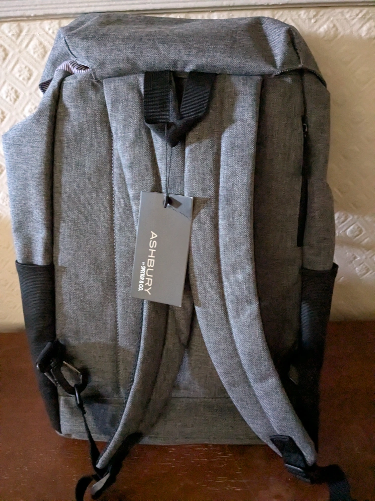 Here's a stylish Ashbury & Fifth Co. backpack in a nice grey colour! It's perfect for everyday use or travel. There is a small tear on the front pocket.