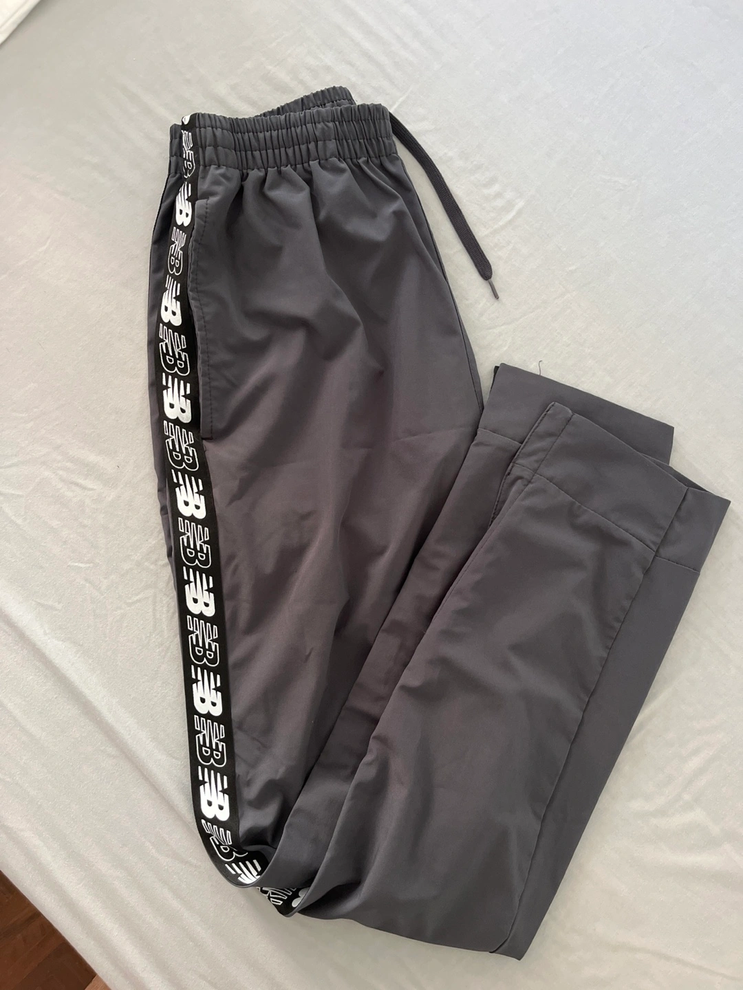 Selling a pair of New Balance track pants in a stylish grey colour! They feature the New Balance logo repeated down the side of each leg. Perfect for workouts or just lounging around