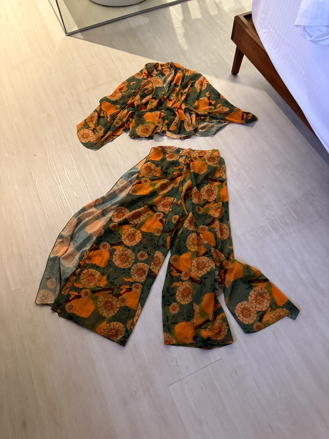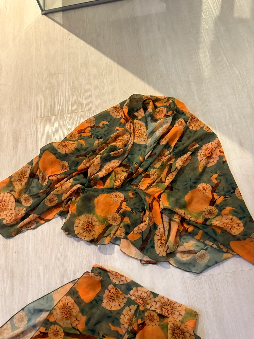 Selling a stylish pants and top set with a unique floral print. The material is lightweight and flowy, perfect for warmer weather. The colours are a mix of orange and green. It's in great condition and ready for a new home!