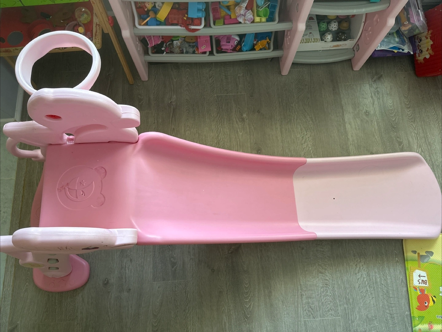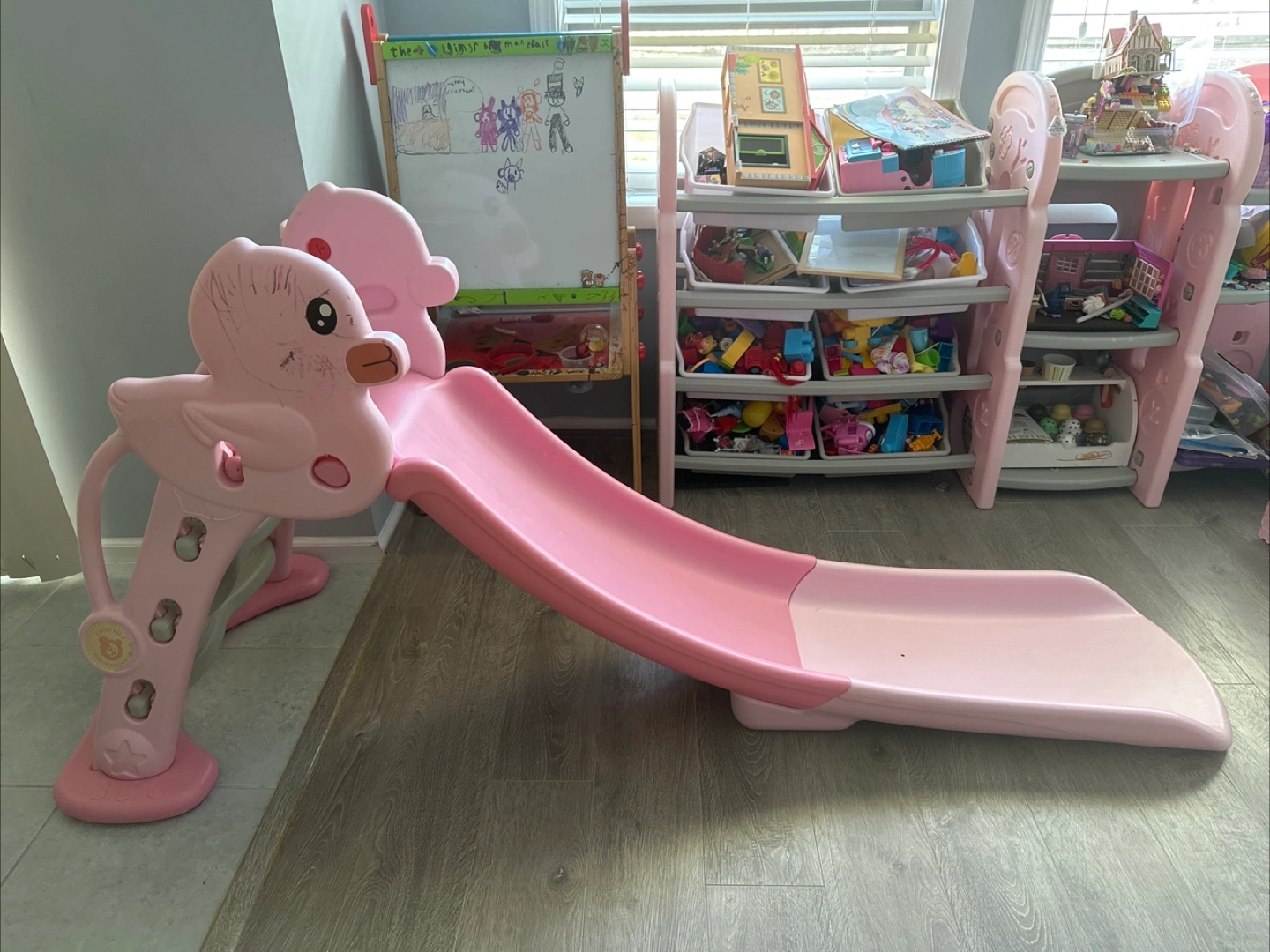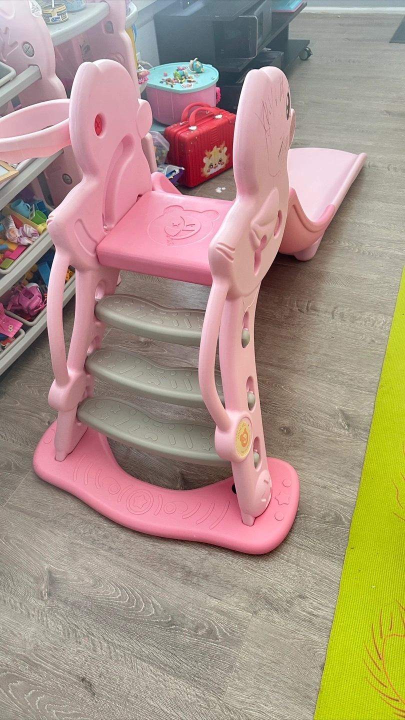 A cute pink duck-themed slide for kids! It's in great shape and ready for a new home. Perfect for indoor or outdoor fun. Your little one will love sliding down this adorable ducky slide!