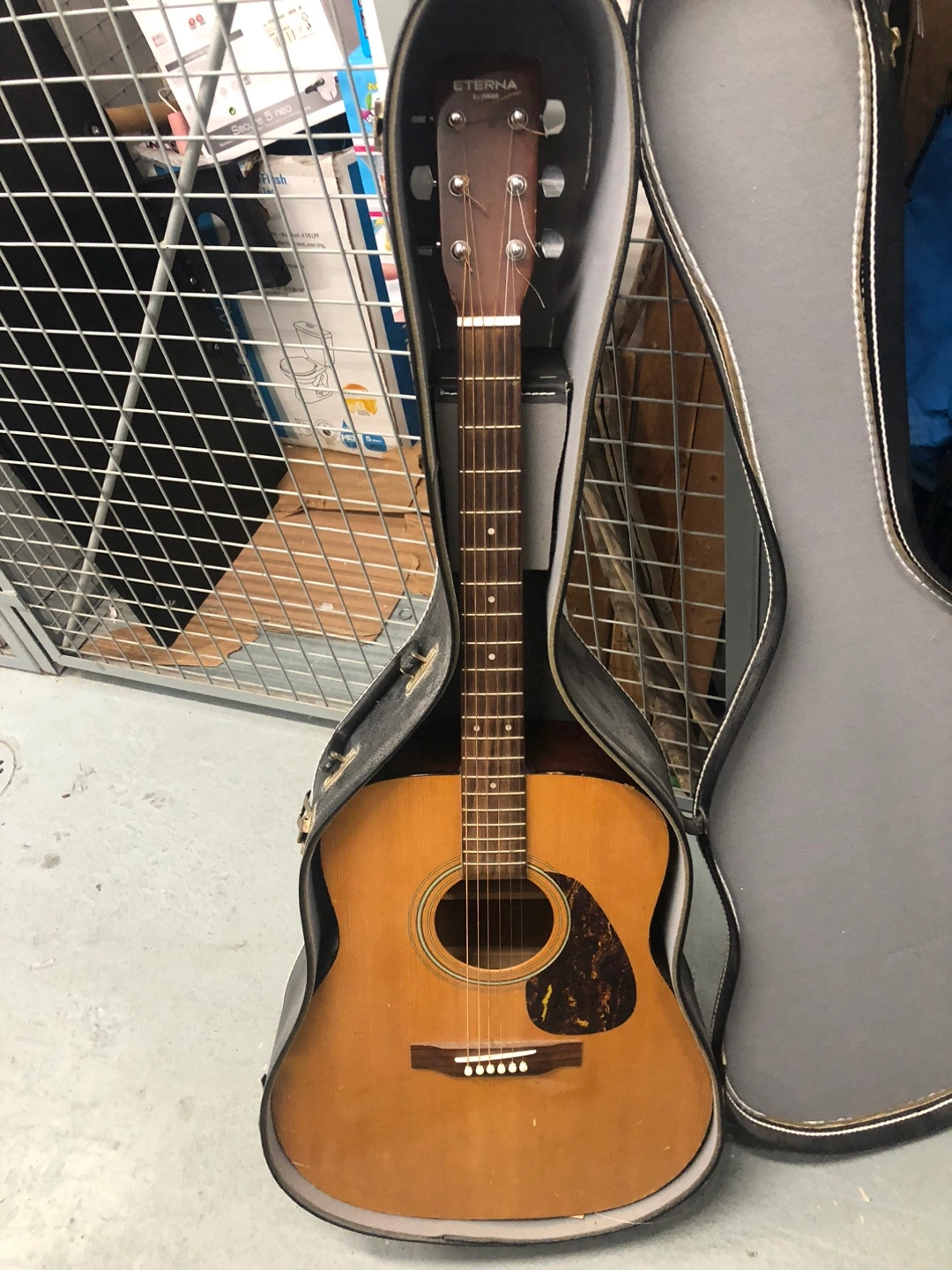 Acoustic guitar with strings. Includes a headstock and tuning pegs. Has some flaws and might need to be restringed. Does not come with case.