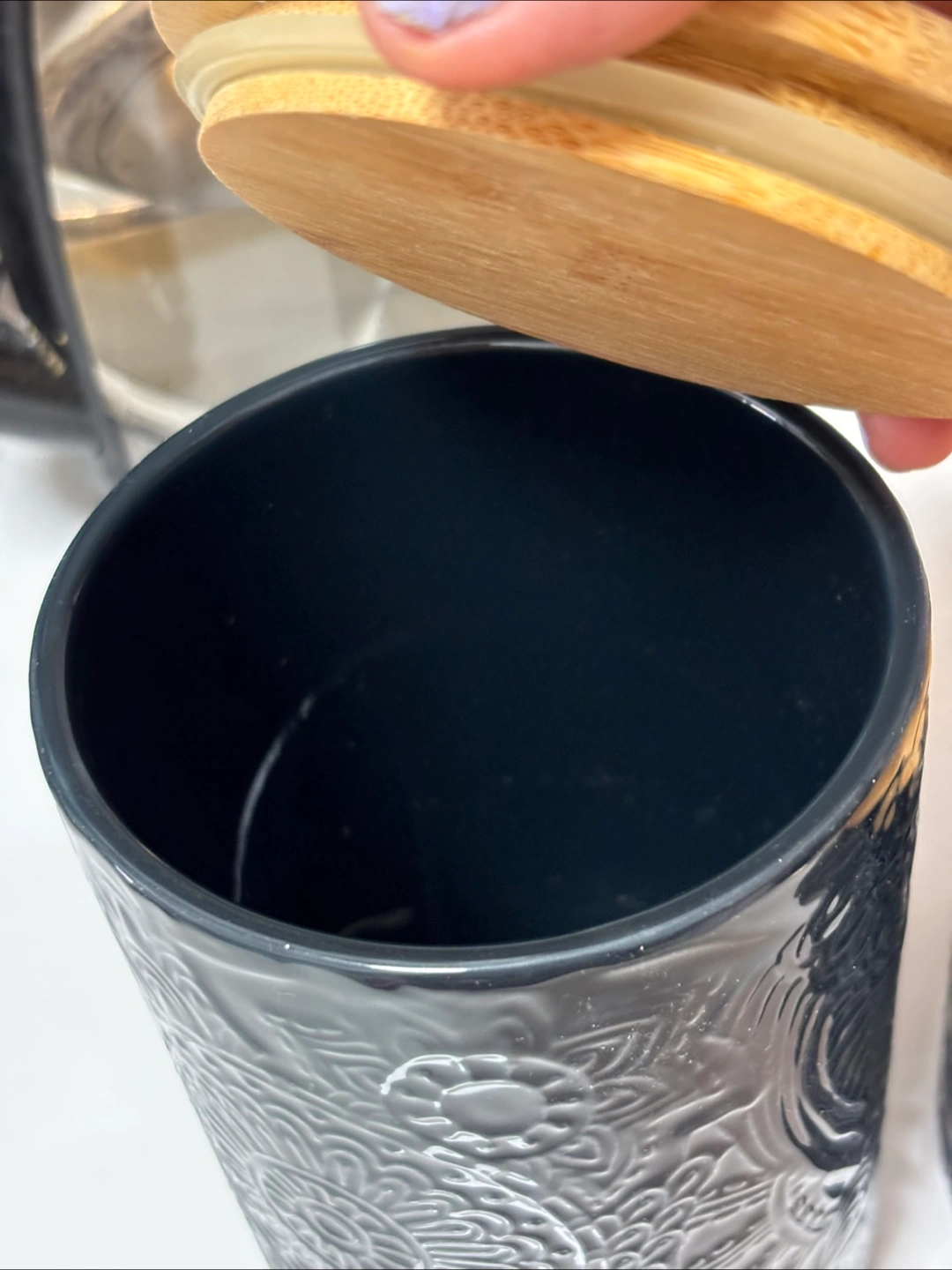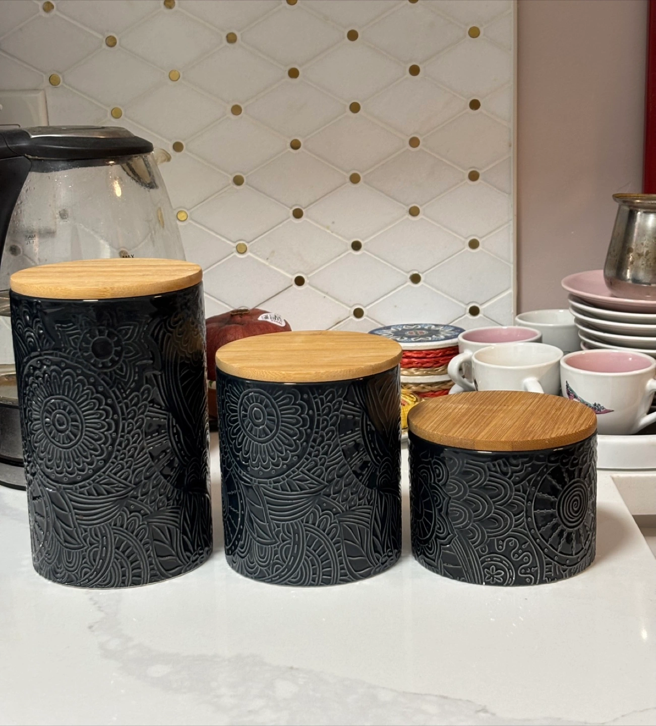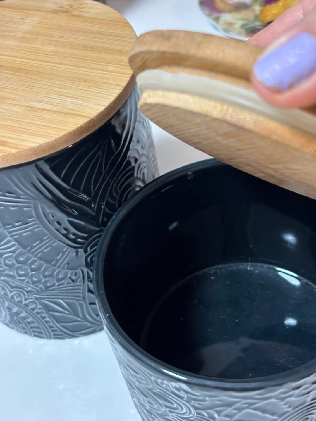 Selling a set of ceramic canisters in blackish grey with bamboo lids! They have a nice floral design. Great for stylish kitchen storage