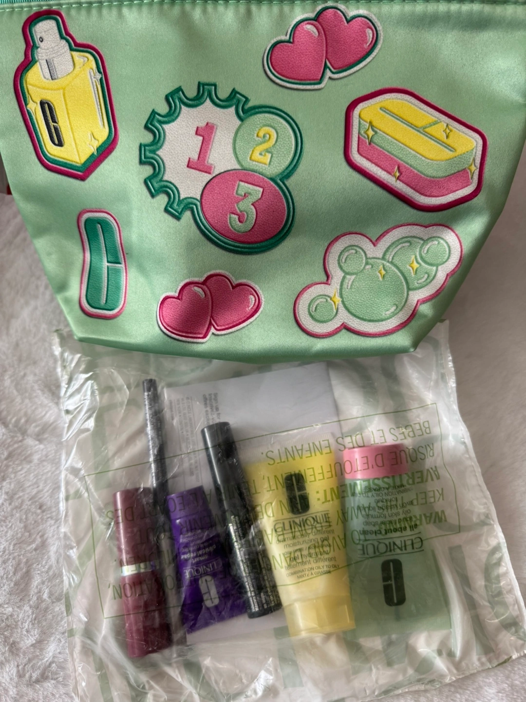 Selling a cute Clinique cosmetic bag that comes with a few travel-sized goodies! The bag is in great condition and features fun, colourful designs. Inside, you'll find some handy travel sizes of Clinique's popular skincare and makeup products, perfect for your next getaway
