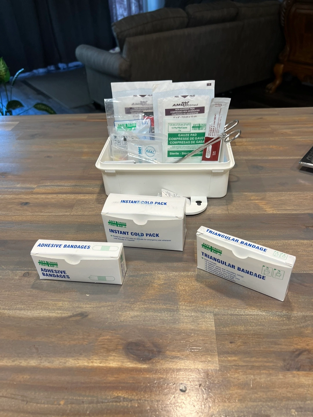 A vintage, clean First Aid Kit. Clasps are secure and close well, and has thumb tack feature, where can be hung up in a washroom, office space, or R.V, etc. comes with everything shown, and can add some extra’s if wanted.
