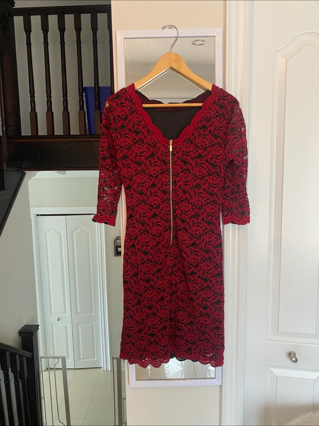 Selling a red lace dress with a zipper and a pair of glitter heels. Both are in great condition and ready for a new home! $40 for both. Dress is size L but will fit M no problem. Material is expandable.