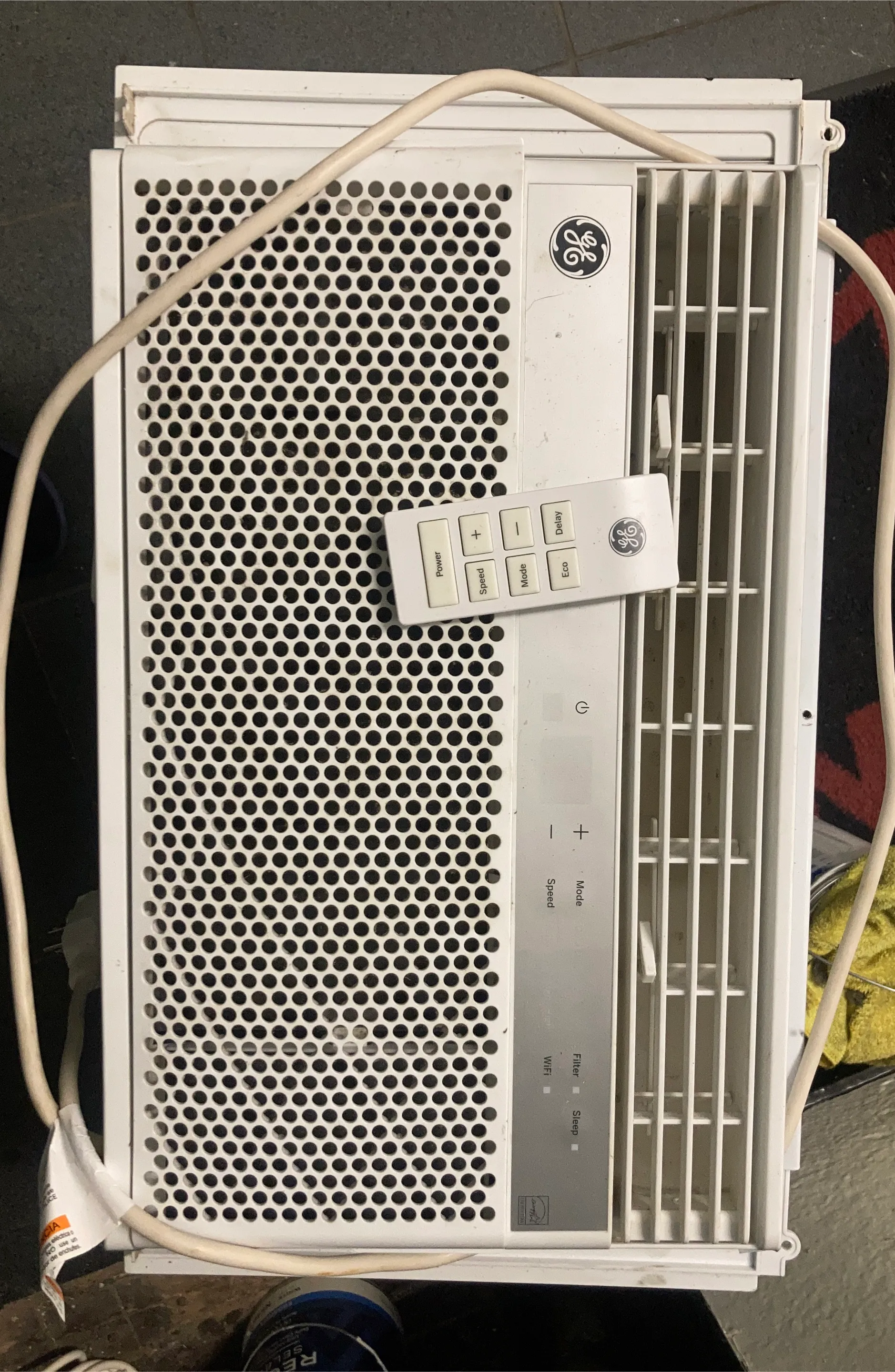 Selling a GE window air conditioner. It comes with a remote control. Features include power, speed, mode, eco, and delay settings. It also has filter, sleep, and WiFi indicator lights