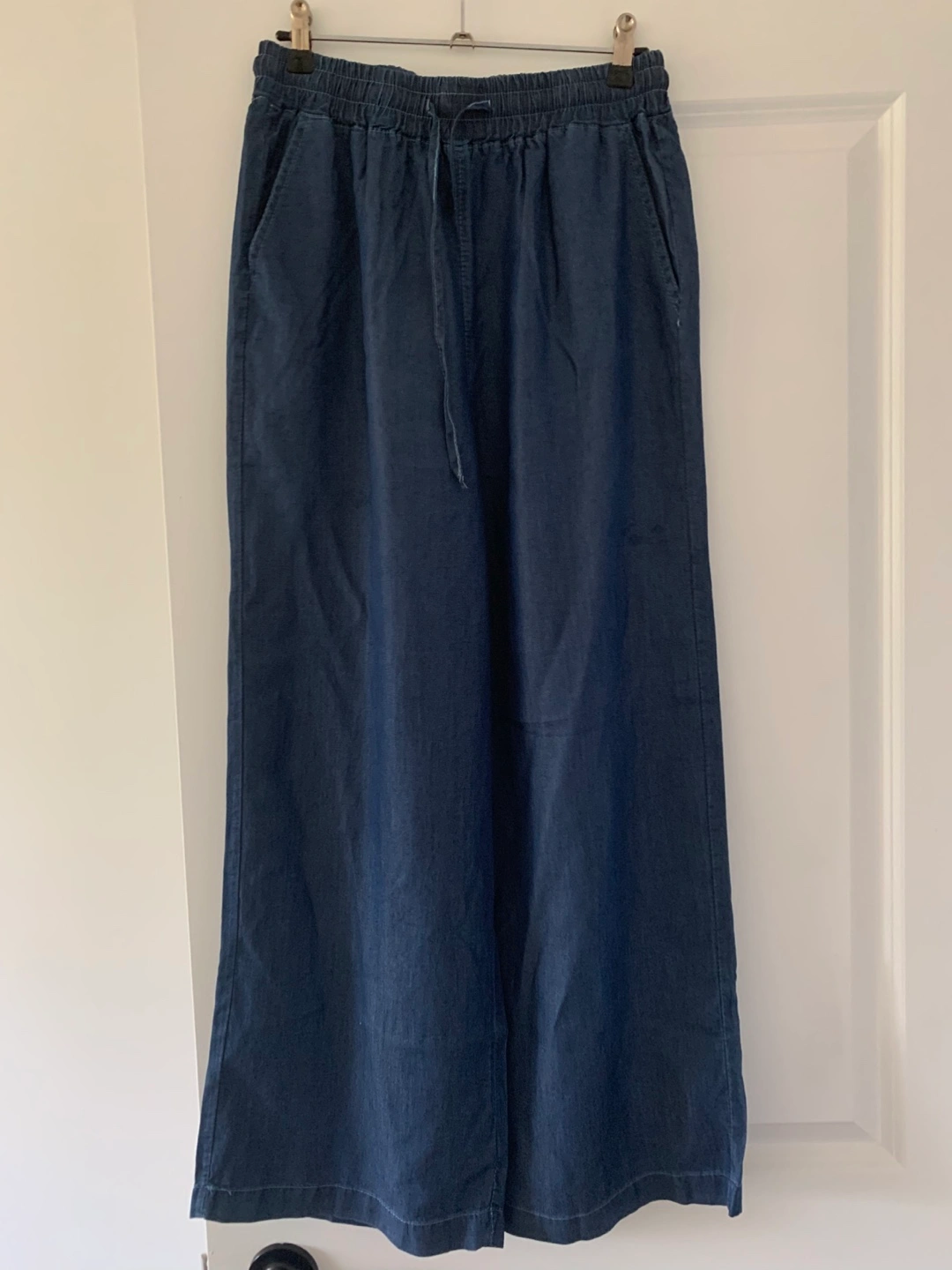 Comfy pair of wide leg denim pants! These are a nice blue colour and have a drawstring waist. Perfect for a casual day out or lounging at home