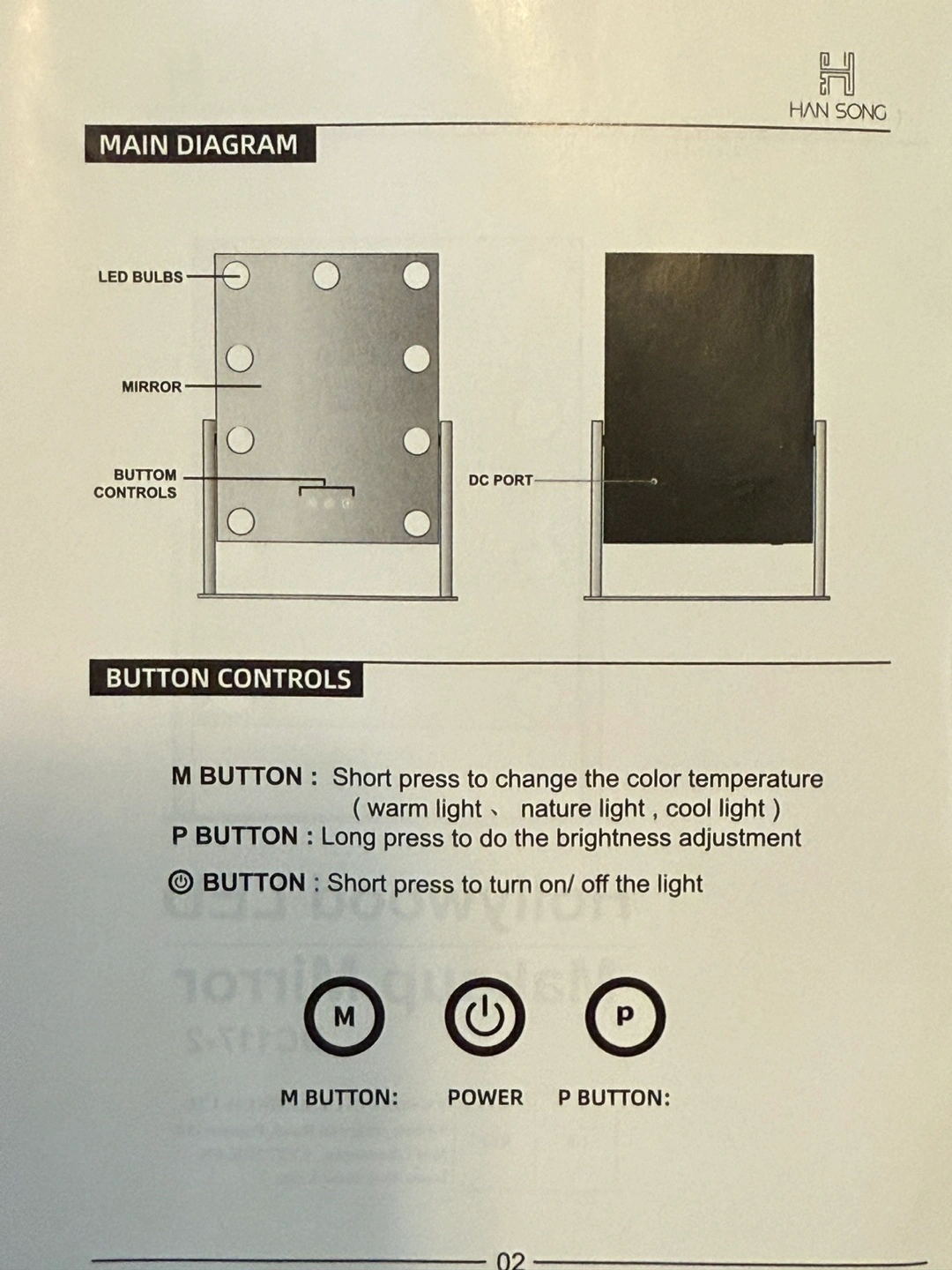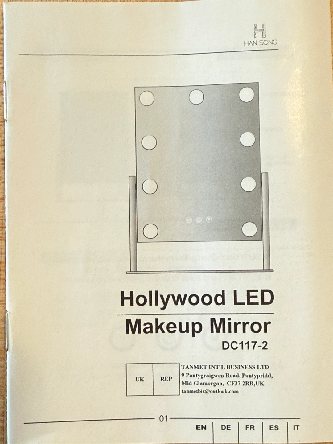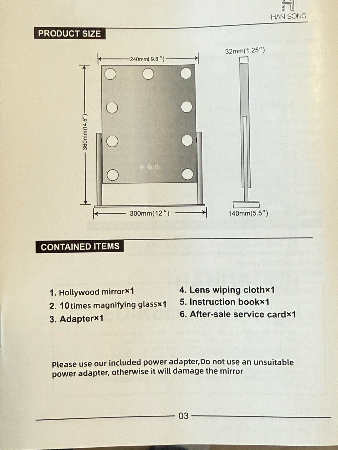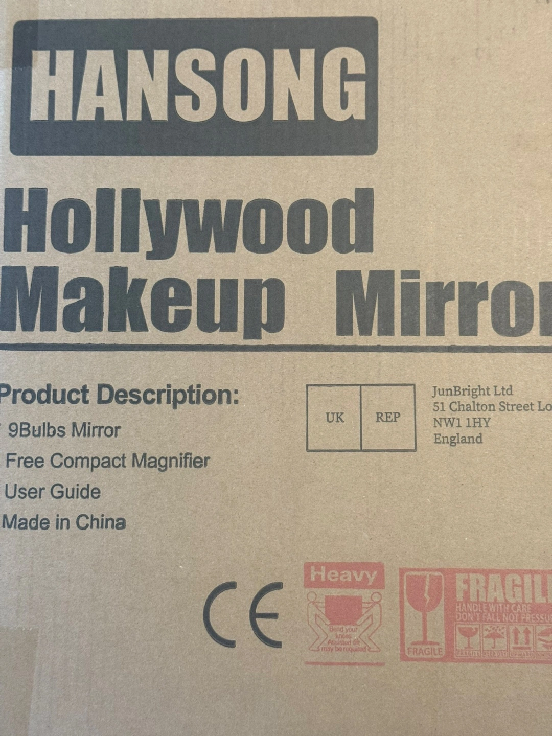 Selling a HAN SONG Hollywood LED makeup mirror. It comes with 9 bulbs and has 3 lighting modes (white, natural, and warm light). The mirror has a touch switch to select different lighting modes. Included items: Hollywood mirror, 10 times magnifying glass, adapter, lens wiping cloth, instruction book, and after-sale service card. Dimensions: 240mm (9.8") x 360mm (14.5") x 300mm (12")