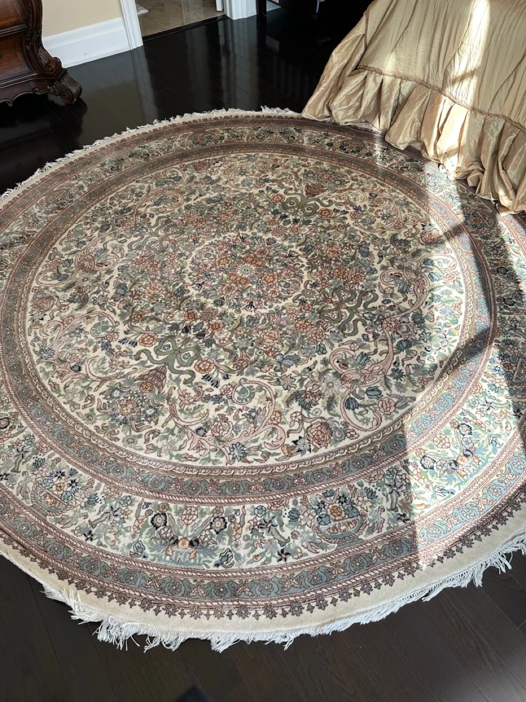 Selling a lovely round rug with a detailed floral pattern! It would look great in any room. It is also 100% wool with the style of indo-kashan.