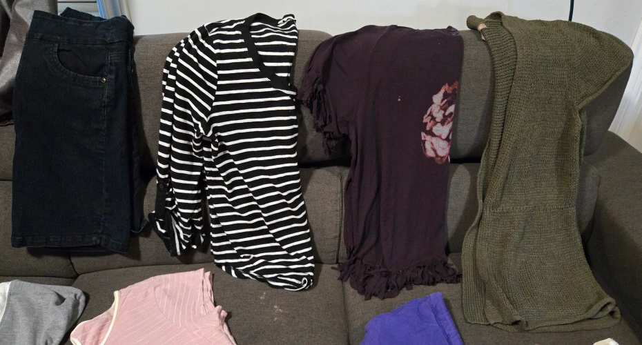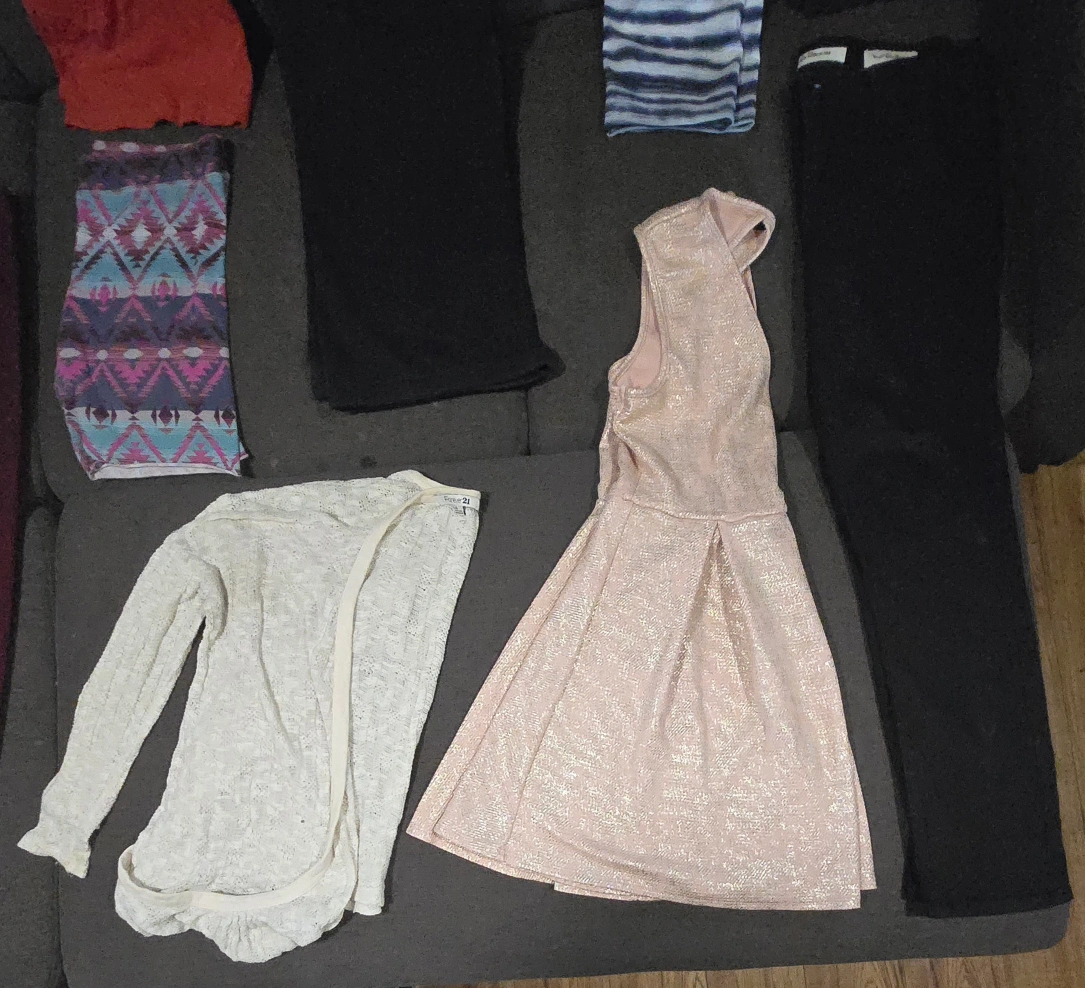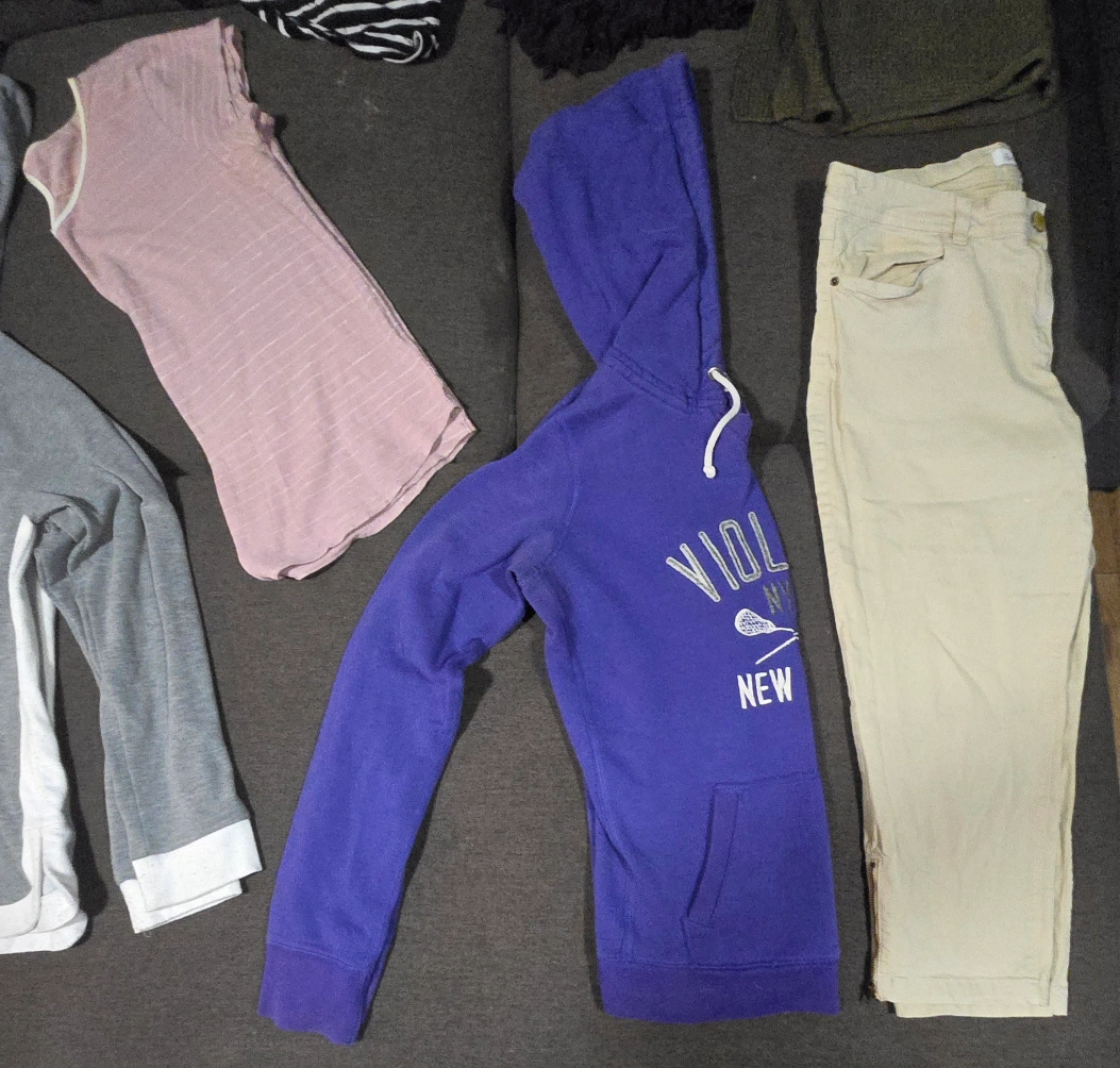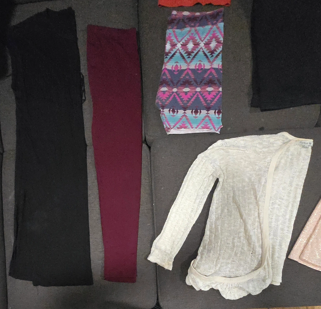 Ladies large size clothes bundle. There is 30 items, making each item around 0.80 cents. Many name brand items. Price is firm. There is: 7 t-shirts 2 tank tops 4 sweaters 3 dresses 3 shorts 1 sweatpants 2 capri's 1 warm leggings 1 jean pants 2 three quarter sleeve shirts 1 long sleeve shirt 2 cardigans 1 knitted sweater tee