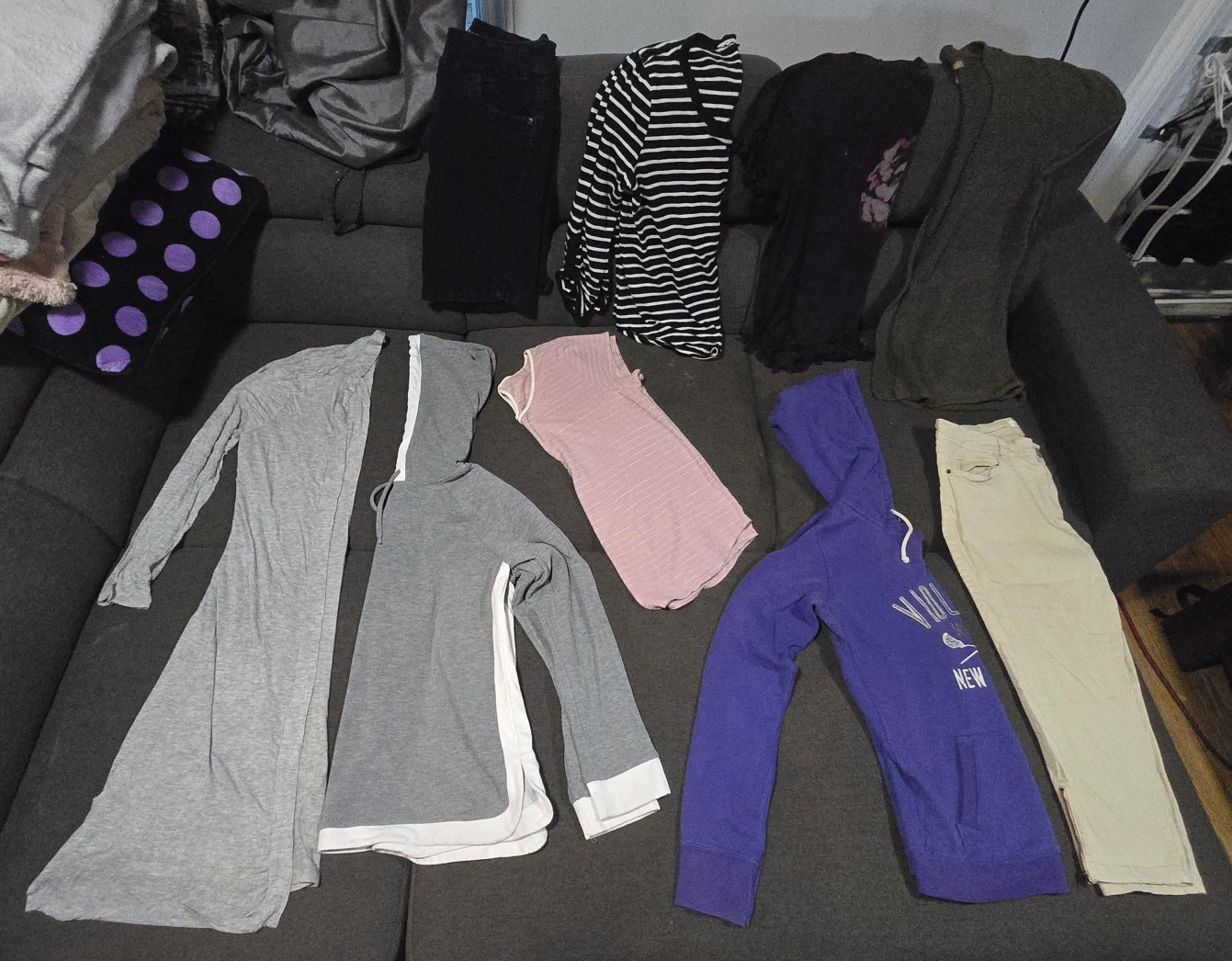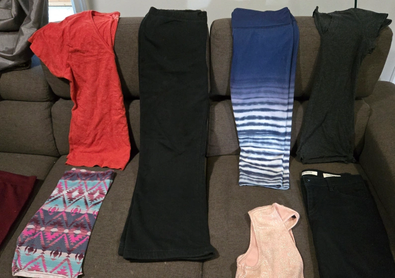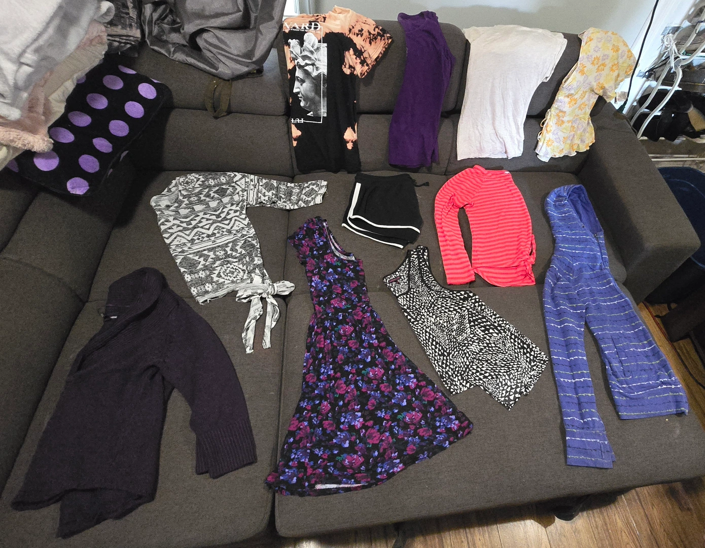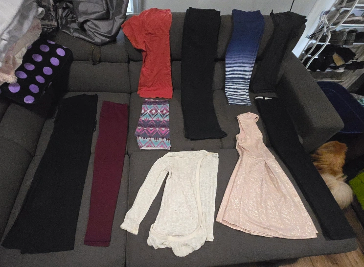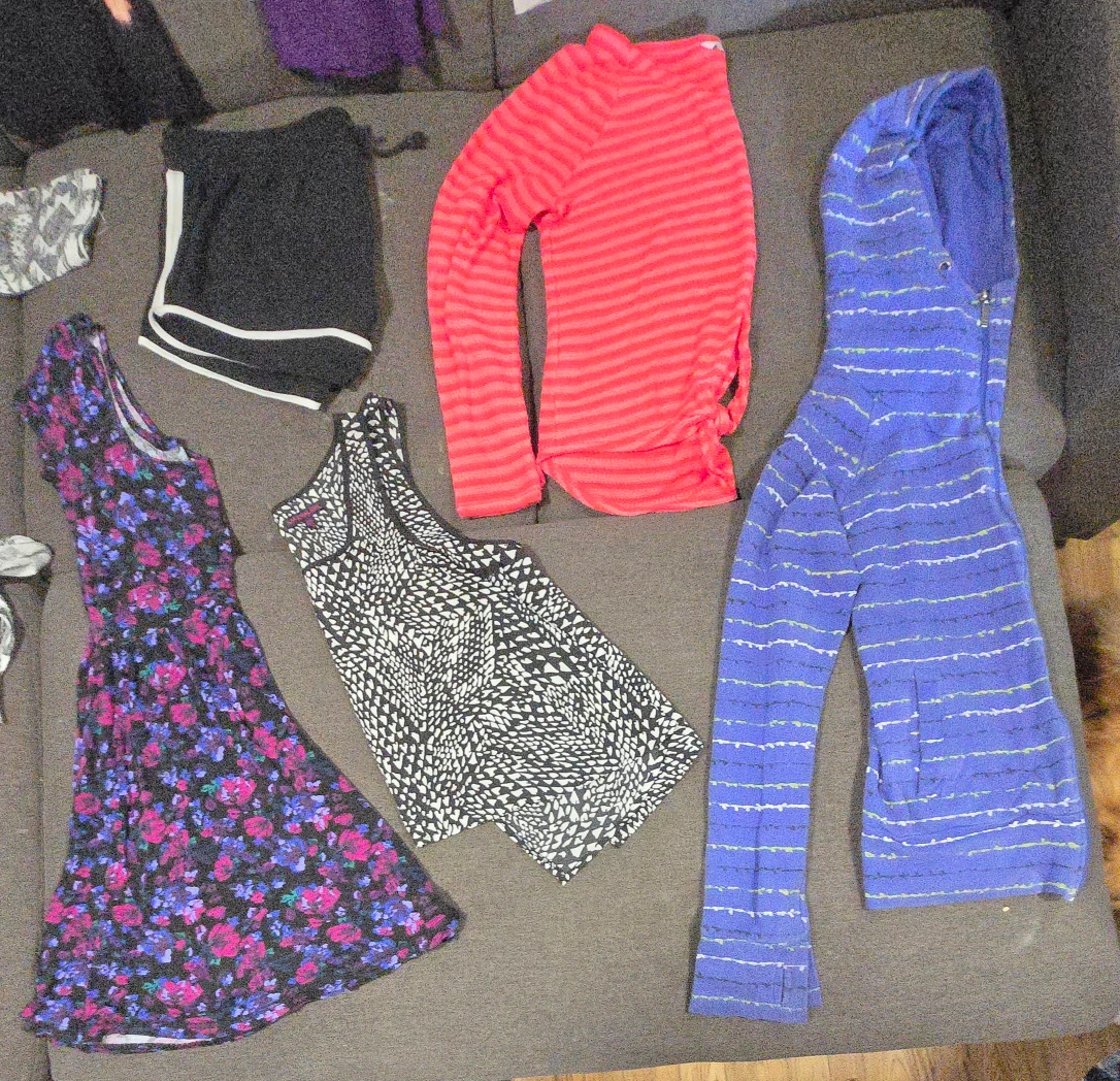 Ladies large size clothes bundle. There is 30 items, making each item around 0.80 cents. Many name brand items. Price is firm. There is: 7 t-shirts 2 tank tops 4 sweaters 3 dresses 3 shorts 1 sweatpants 2 capri's 1 warm leggings 1 jean pants 2 three quarter sleeve shirts 1 long sleeve shirt 2 cardigans 1 knitted sweater tee
