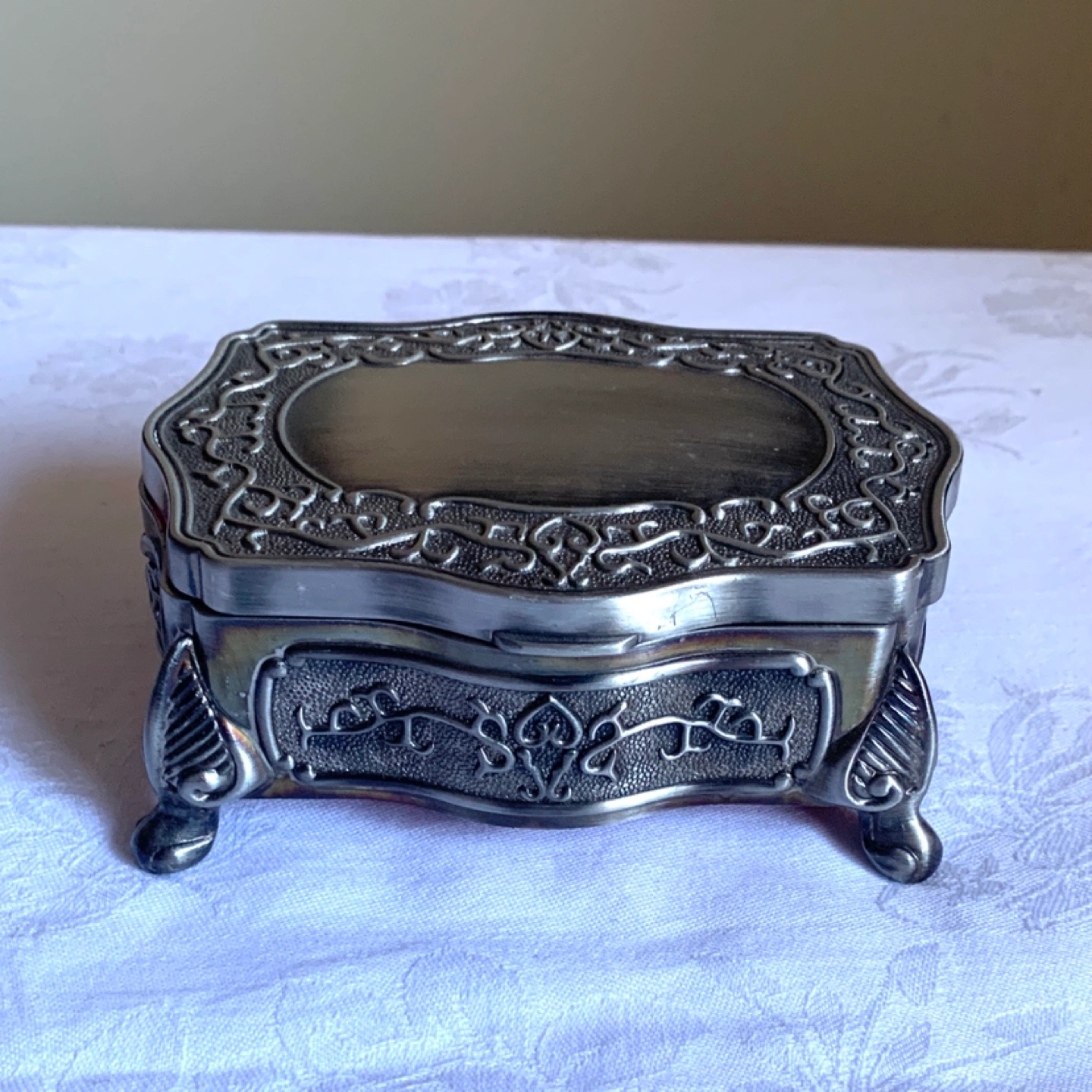 Selling a vintage silver-tone jewelry box with a red velvet interior. It's in great condition and perfect for storing your precious items.