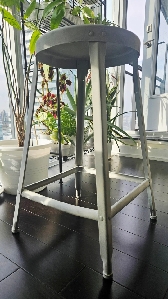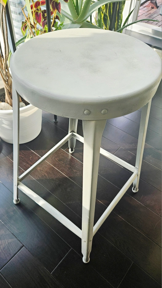 Selling a sturdy metal bar stool in a neutral white/grey colour. It's perfect for adding some extra seating to your kitchen or bar area. This stool is in great shape and ready for a new home!