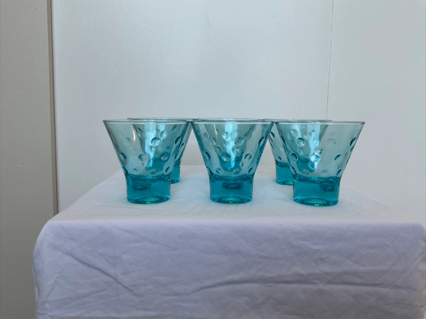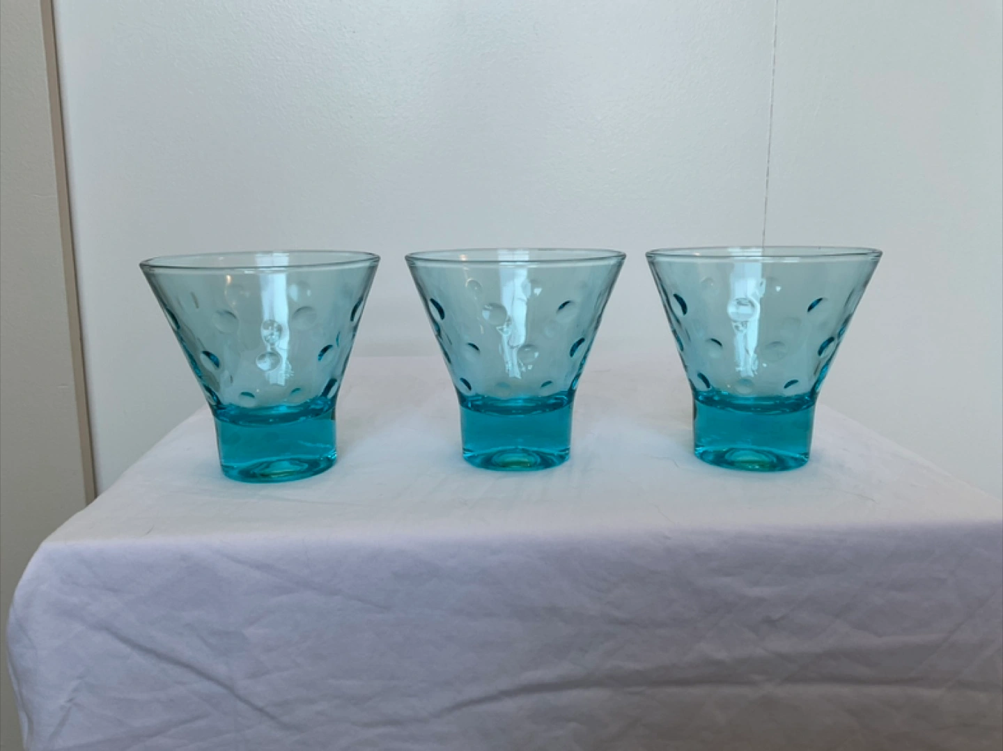 Made in USA. Flared glasses have inverted polka dots visible from the inside. Holds 4 oz. These glasses are 3” tall, top measures 3.25” diameter, bottom 1.5” diameter. Cash only Marine Drive and Kerr area
