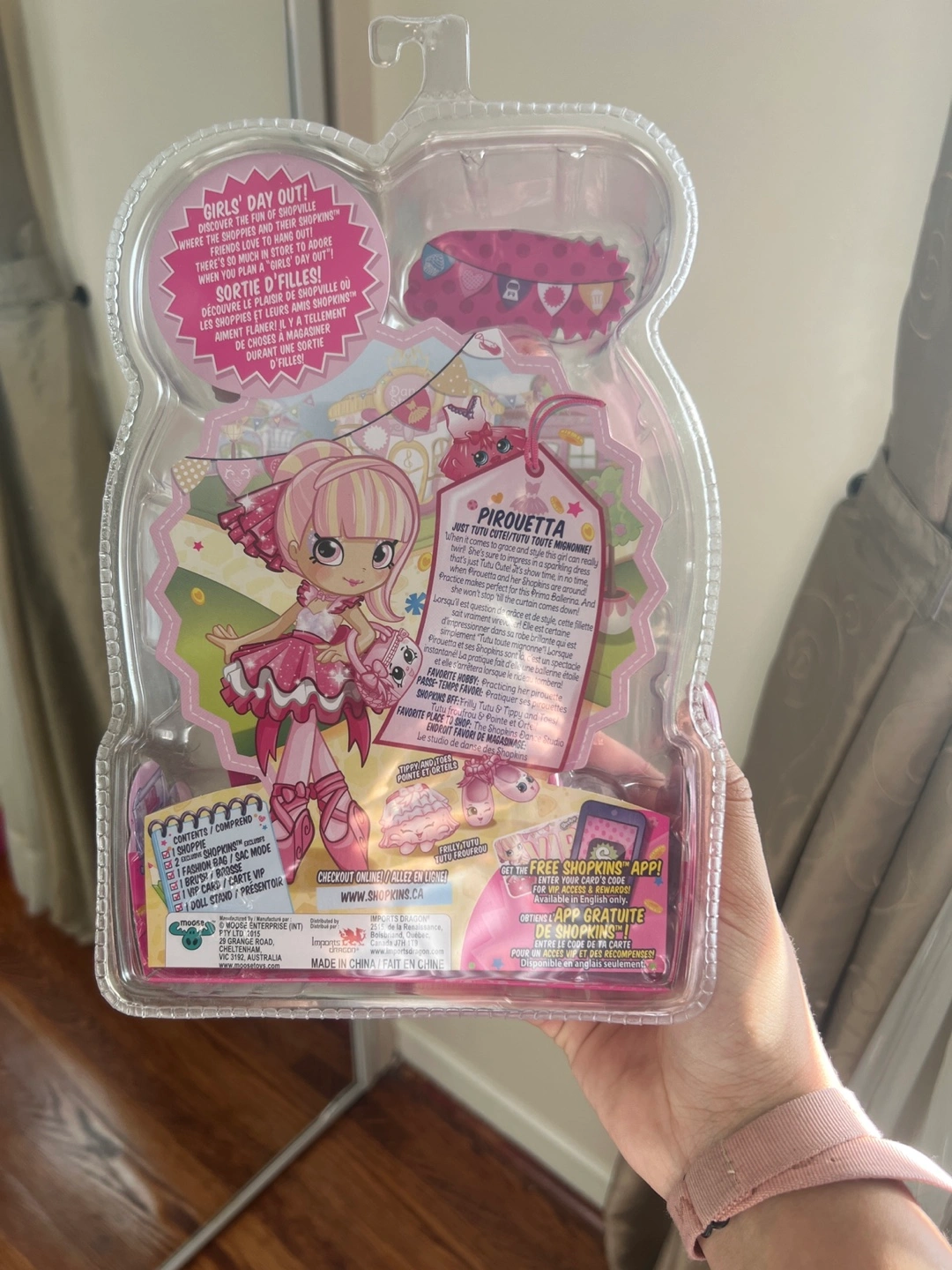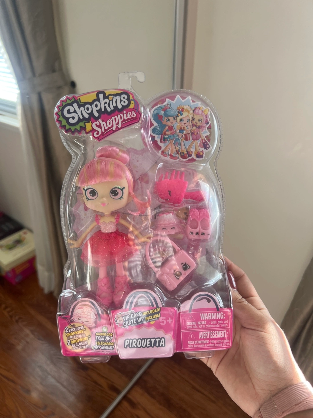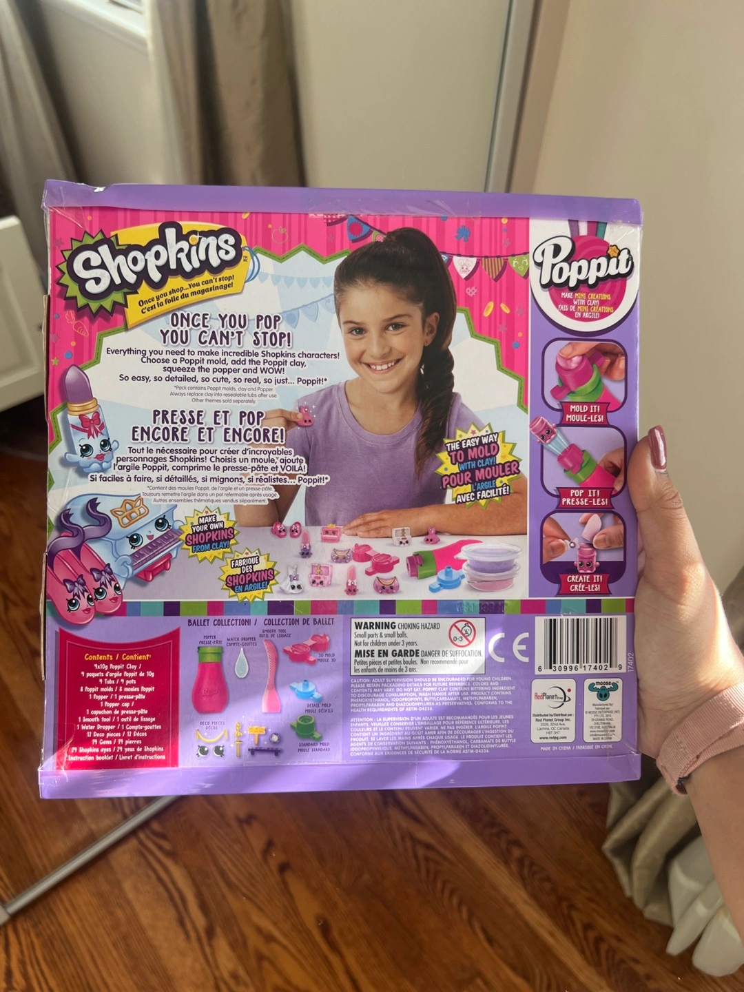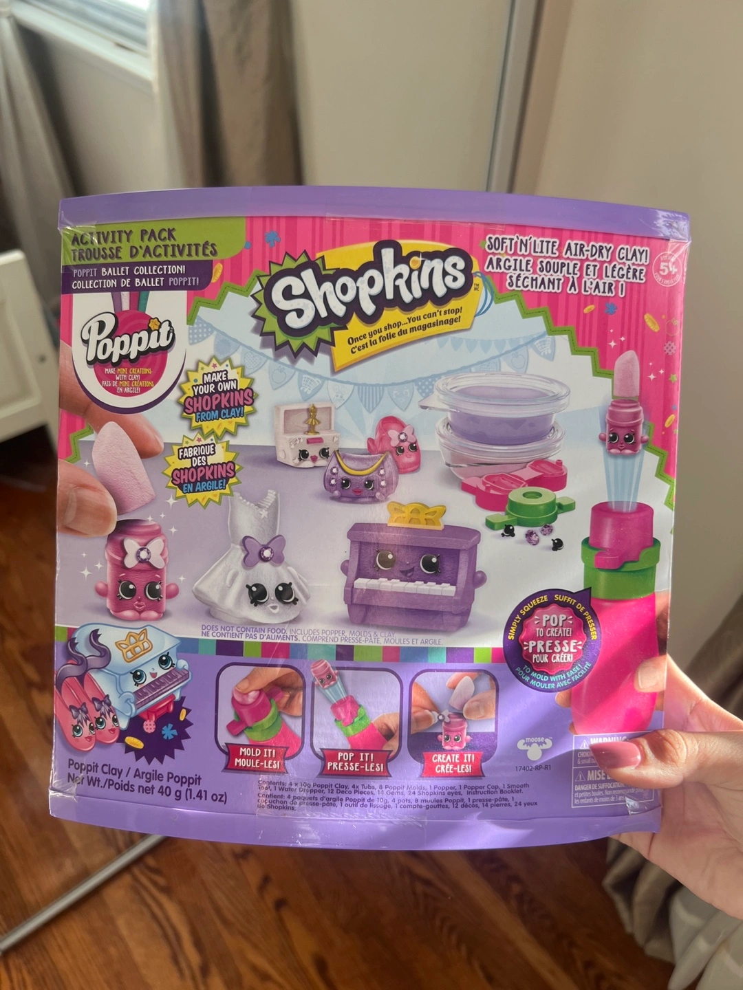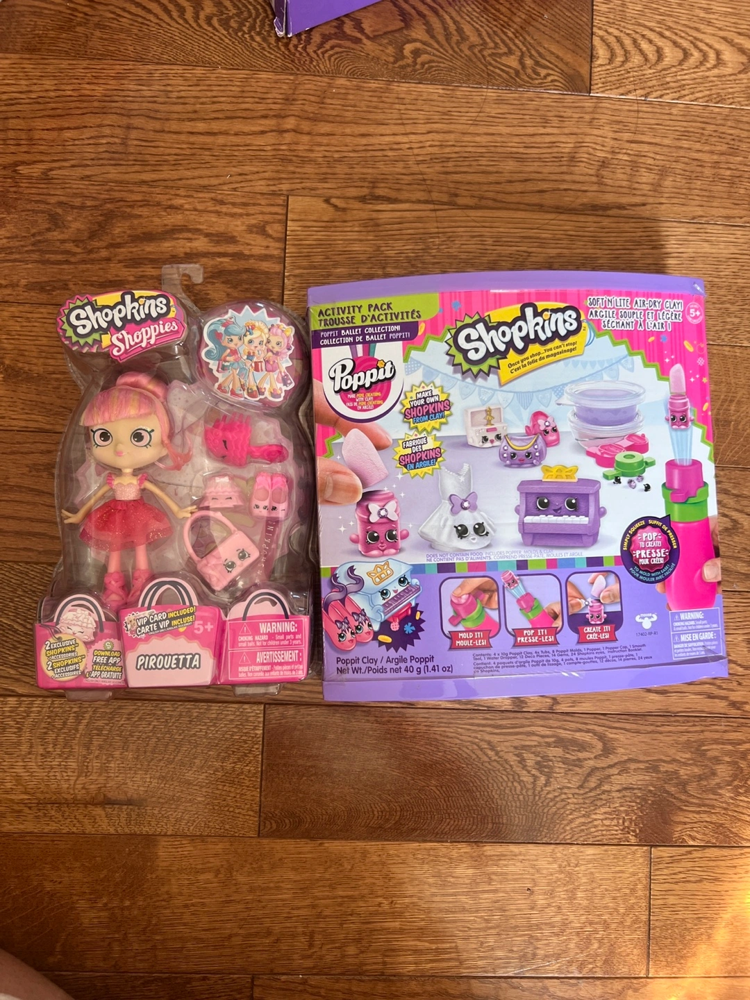 Shopkins Poppit Ballet Collection activity pack and a Pirouetta doll. The activity pack includes soft, lite air-dry clay to create your own Shopkins. The Pirouetta doll is still in its original packaging and includes 2 Shopkins and a doll stand.