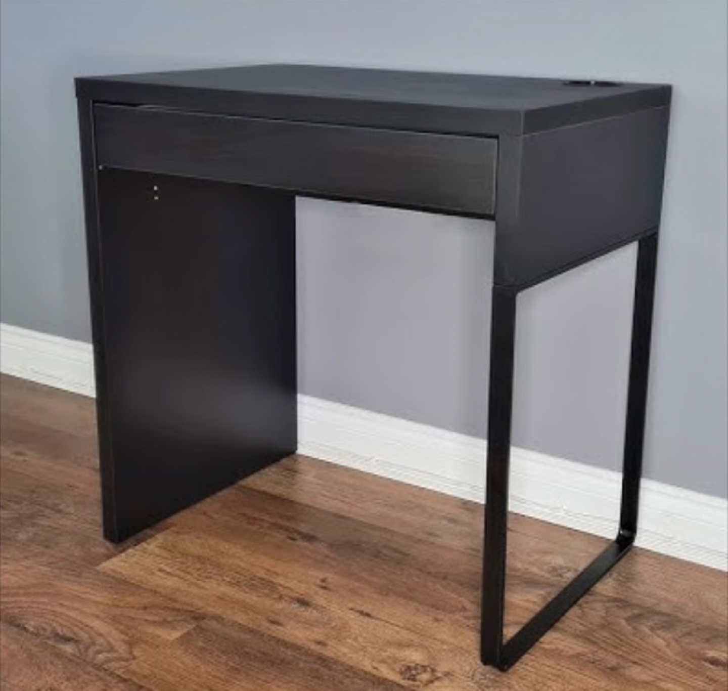 Here's a simple black desk with a drawer, perfect for a small space or home office! It's in great condition and ready for a new home