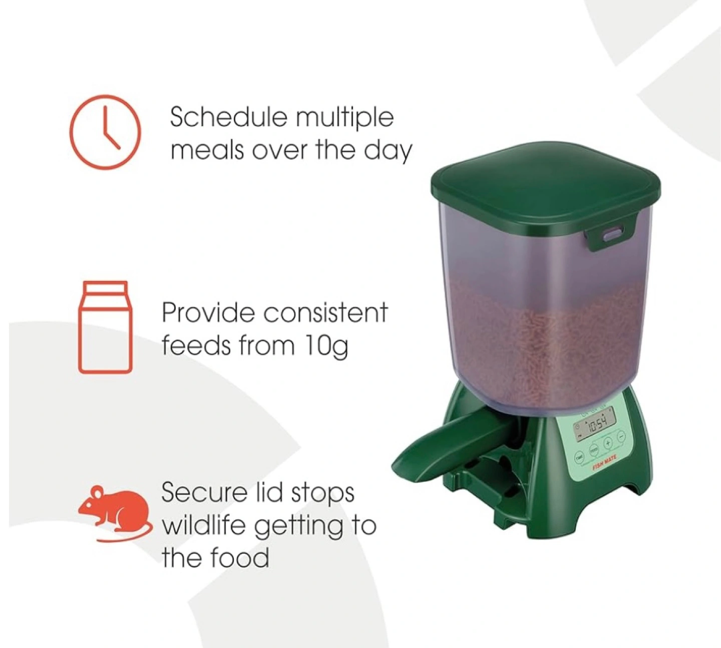 * Versatile Feed Options: Suitable for most popular sticks and pellets, the feeder's unique mechanism delivers accurate feed sizes from 15ml upwards.