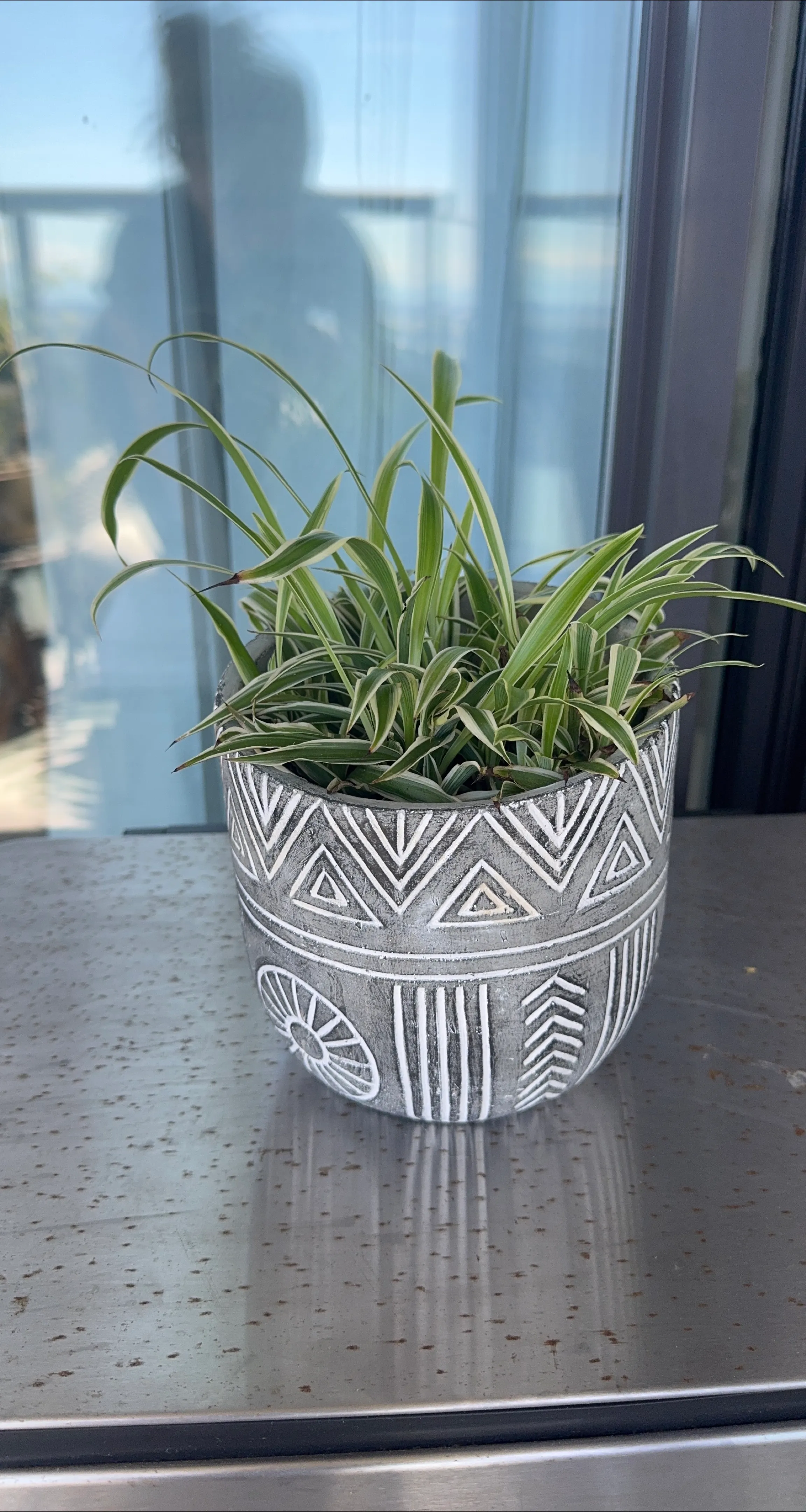 I'm selling a cute decorative plant pot! It's grey with a unique white pattern around the outside. Perfect for adding a touch of style to your indoor plants comes with the spider plants inside 🥰
