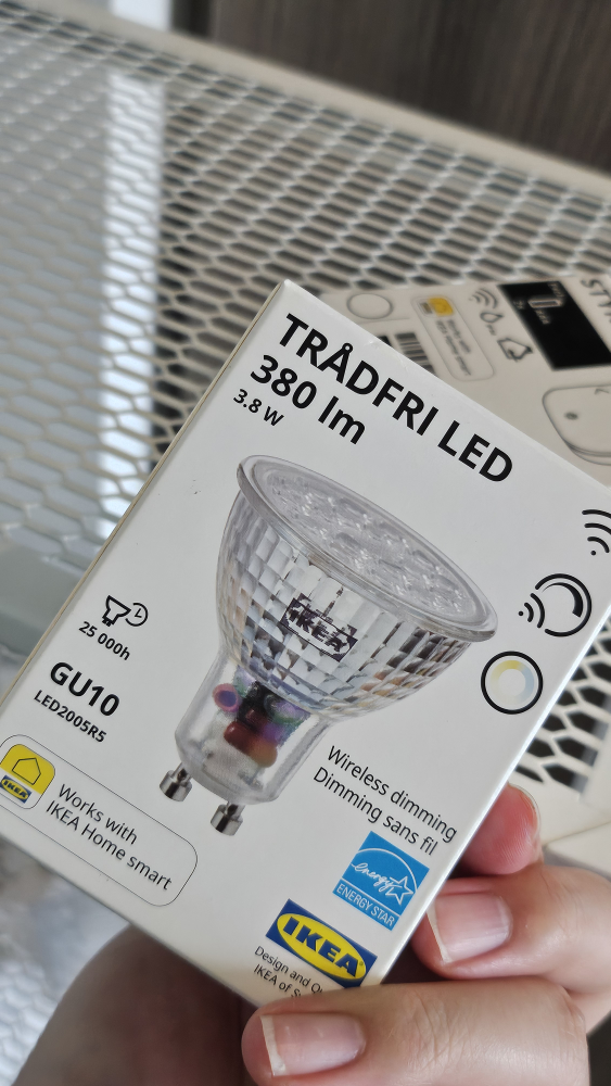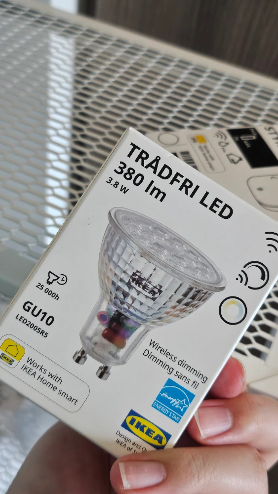 Selling an IKEA TRADFRI LED bulb. It has wireless dimming and works with IKEA Home smart. It's a GU10 LED2005R5 model, 380 lm, and 3.8W. The bulb has a lifespan of 25,000 hours.