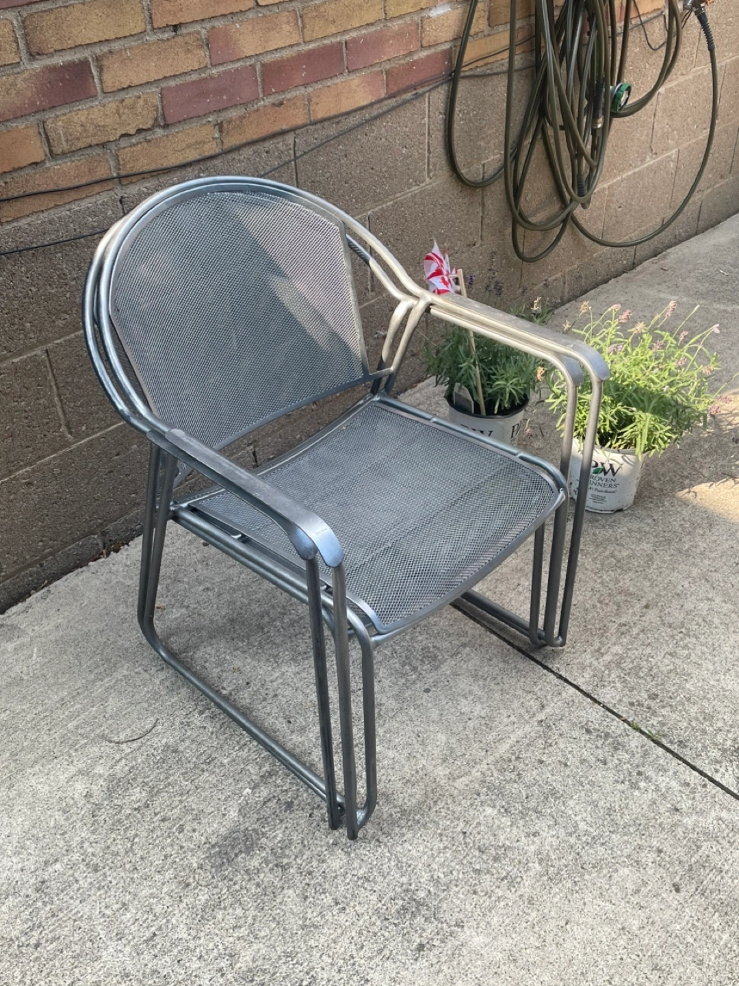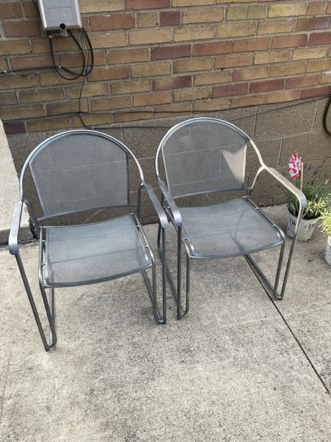 Selling a set of two outdoor chairs! They have a mesh seat and back, perfect for relaxing on the patio or in the garden. They're in good condition and ready for a new home.
