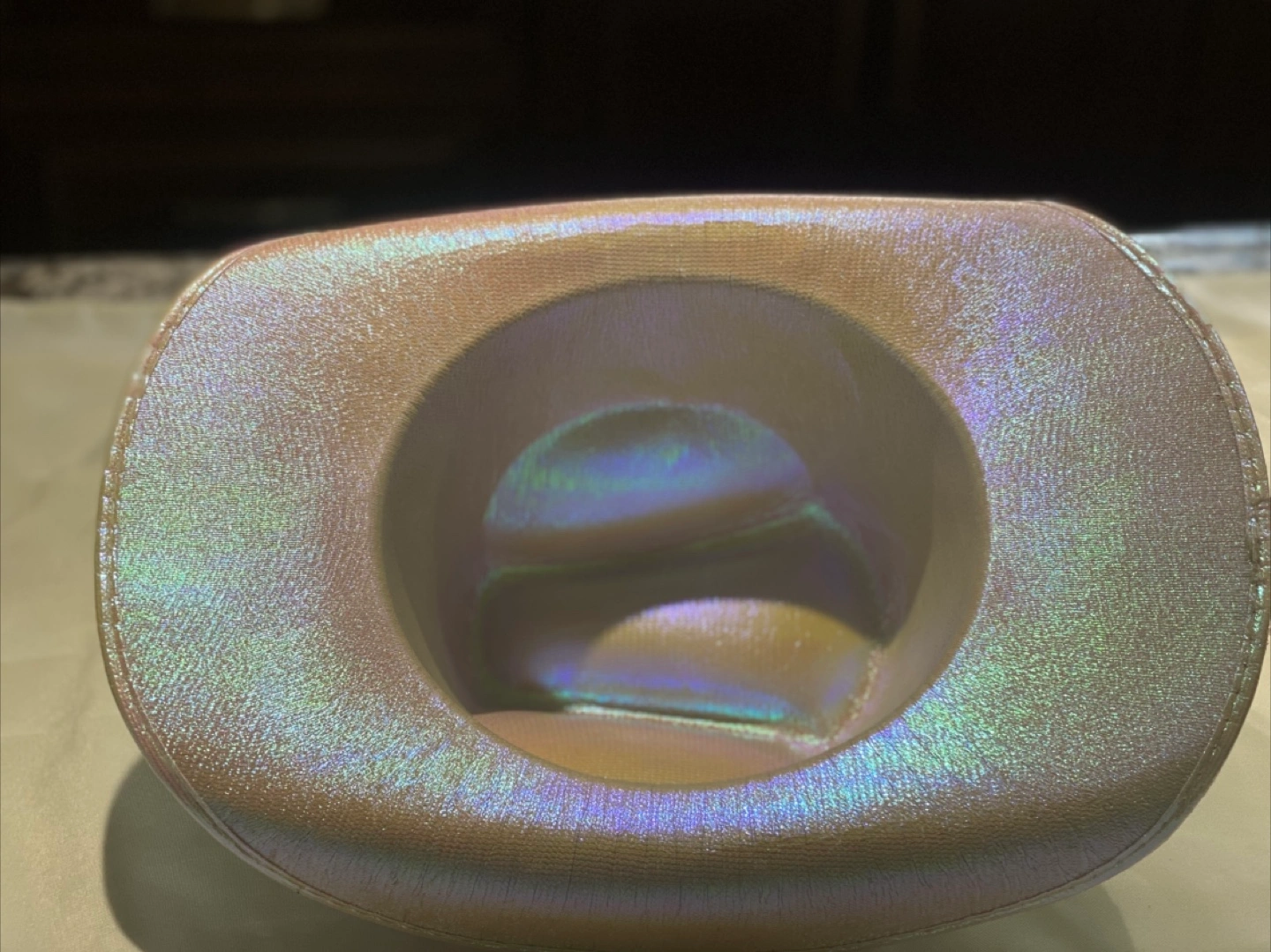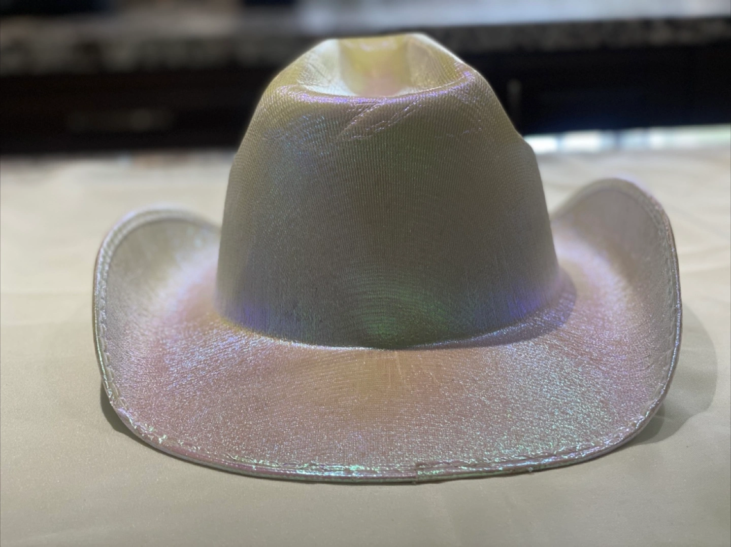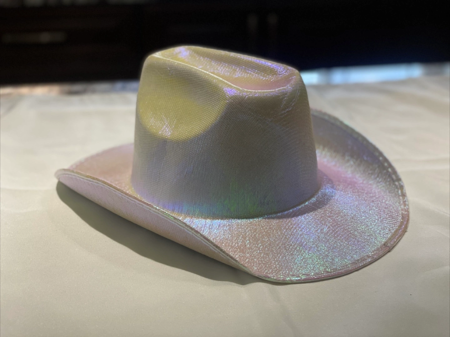 Selling an iridescent cowboy hat! It's a fun and unique accessory to add to your collection. The hat has a cool, shimmering effect that catches the light. Perfect for parties, events, or just adding a bit of sparkle to your day!
