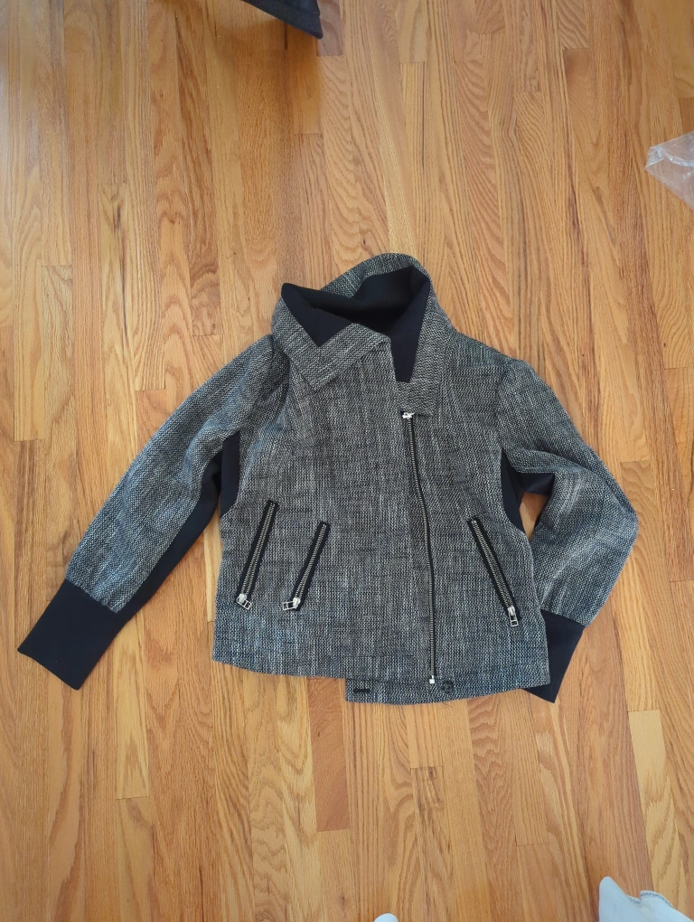 Stylish jacket with an asymmetrical design and grey tweed-like material with black accents. The jacket has a high collar and zipper details, making it a fashionable addition to any wardrobe. Size 6