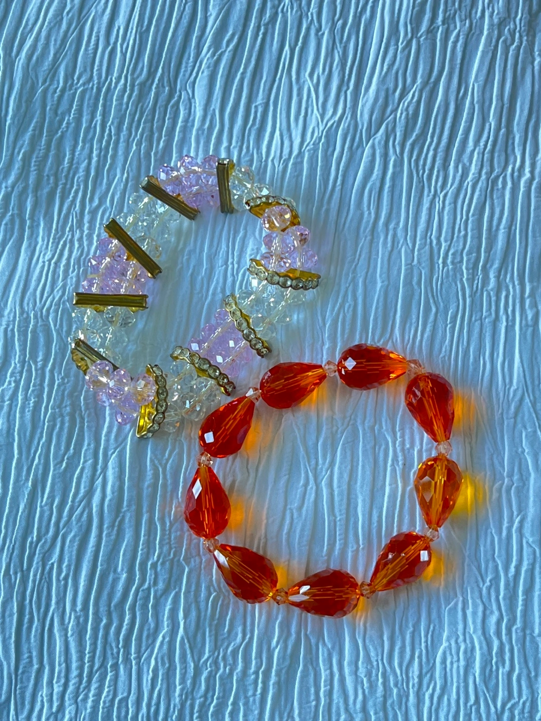 Selling two unique beaded bracelets! One features orange teardrop beads, and the other has a mix of pastel and clear beads with gold accents. They're both in great condition and ready to add some sparkle to your outfit!