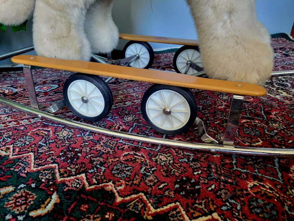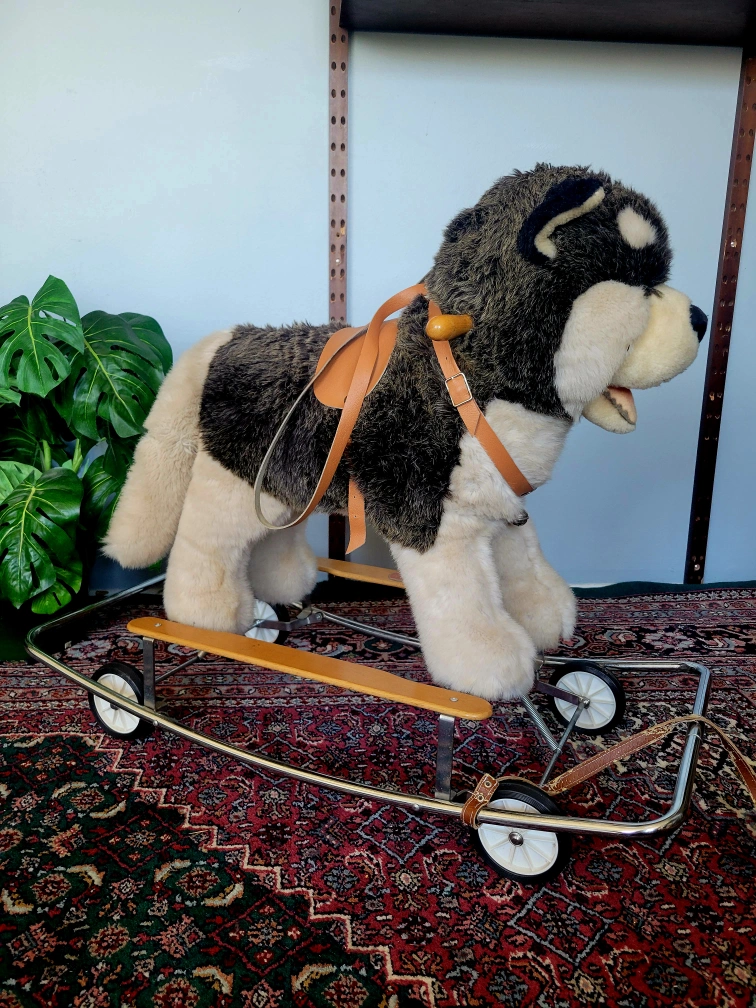 Vintage made in Italy plush husky rocking/rolling stuffed toy with genuine leather saddle and retractable wheels.
