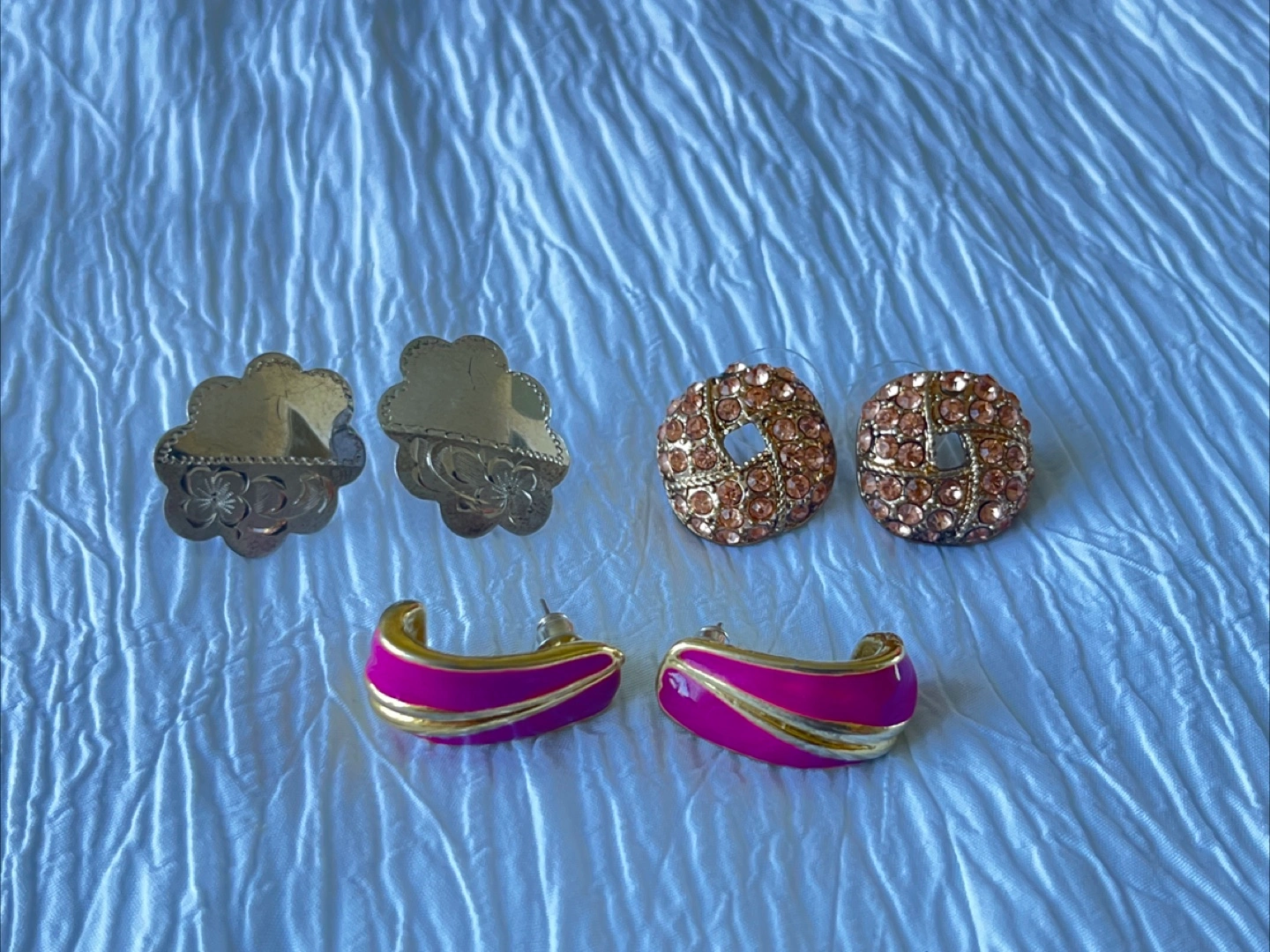 Selling a bundle of earrings! Includes a pair of flower-shaped studs, a pair of rhinestone studs, and a pair of purple and gold hoops.