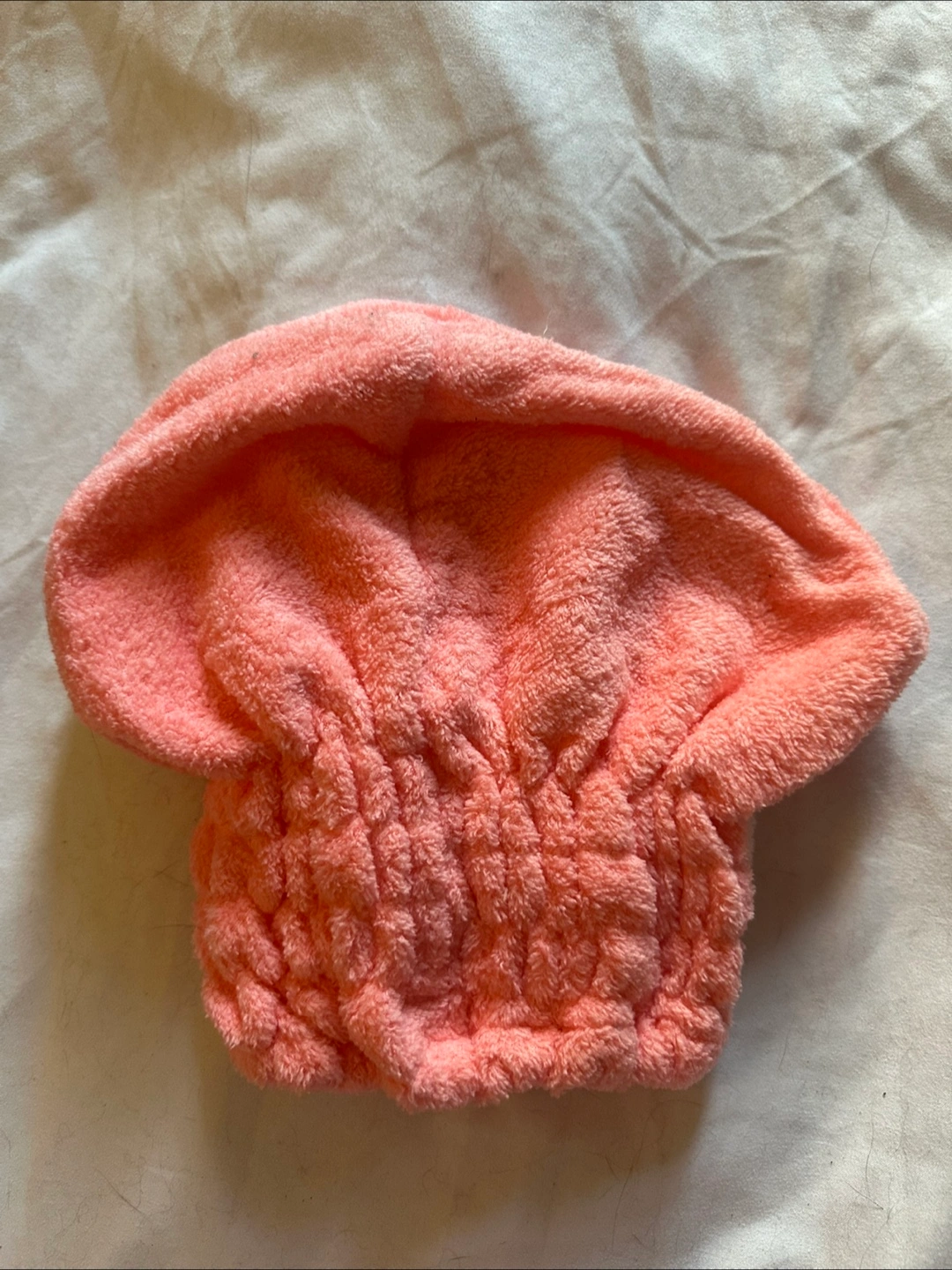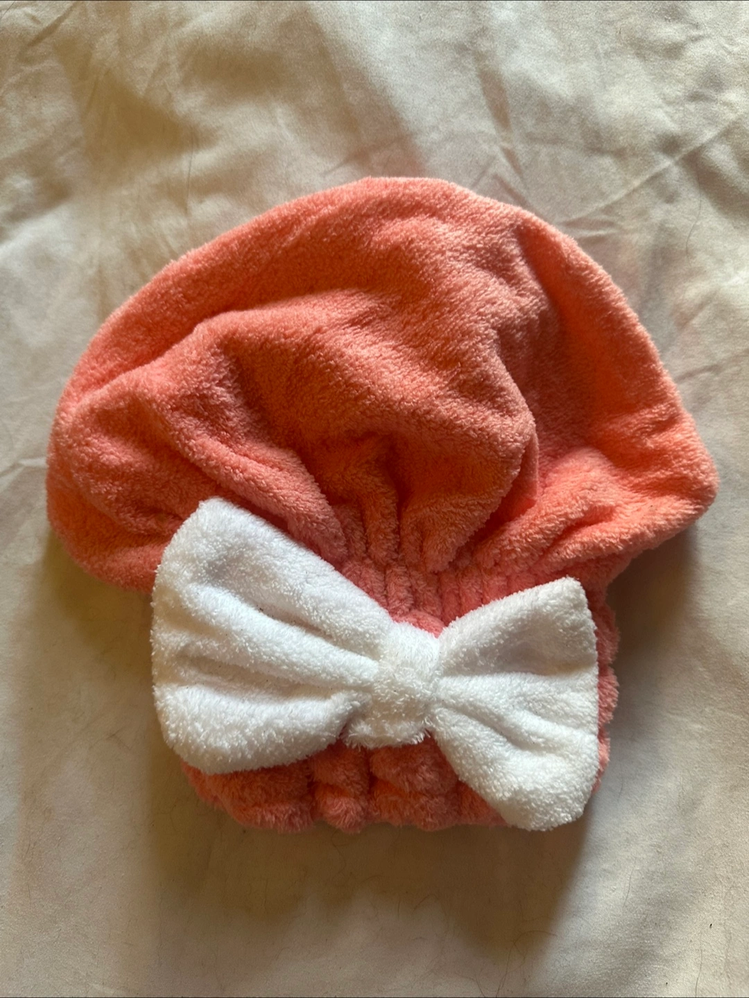 Cute coral-coloured microfiber hair drying cap! It has a soft, plush texture and a sweet white bow detail. Perfect for quickly drying your hair after a shower or bath. Brand new