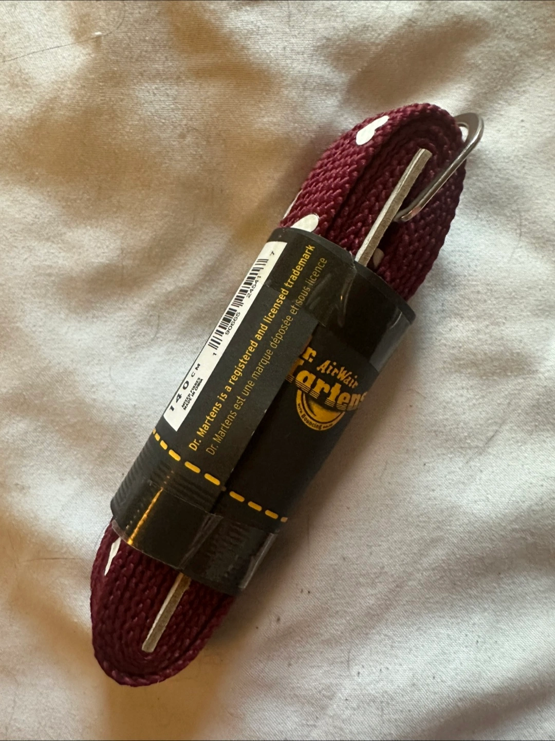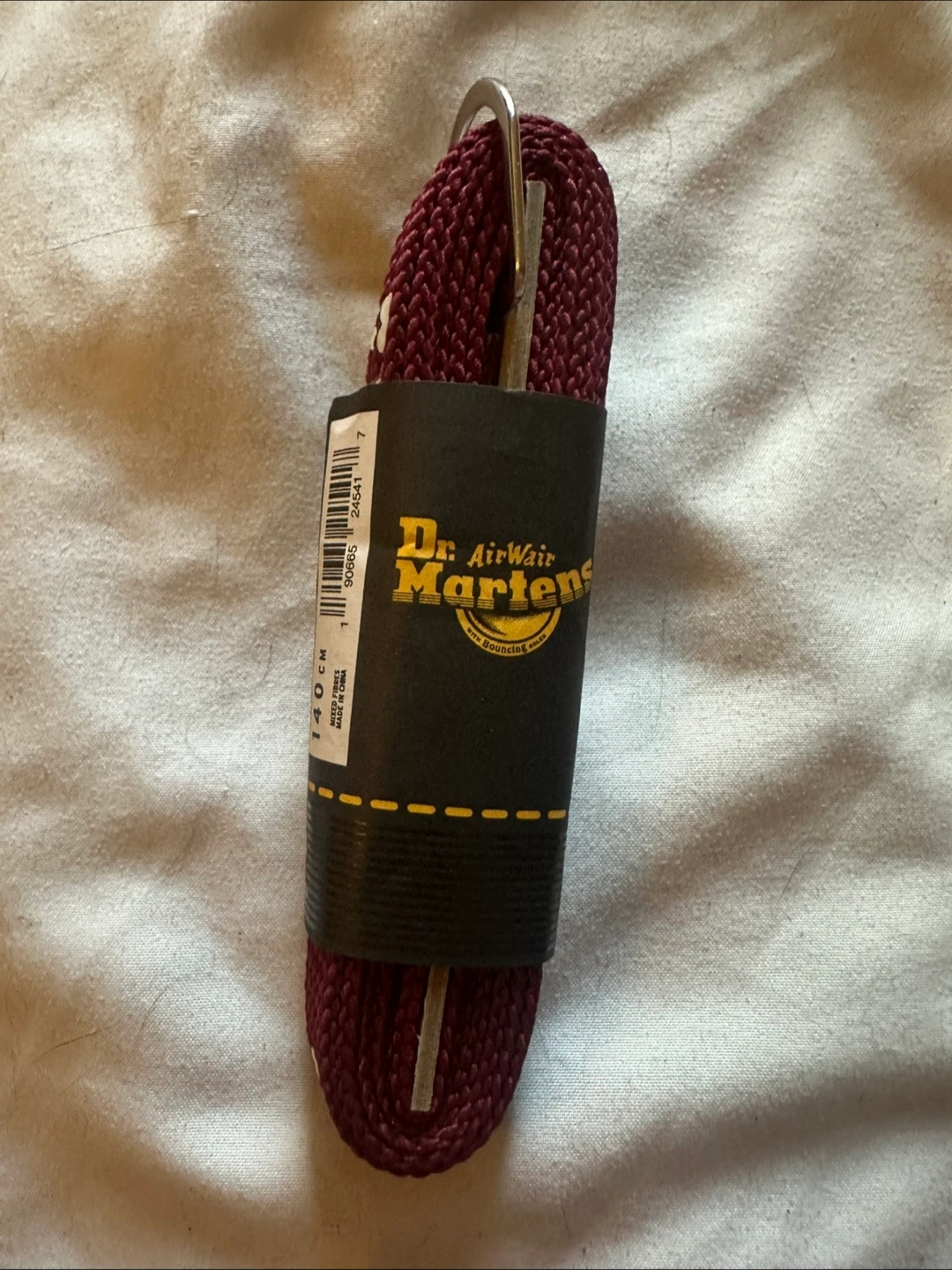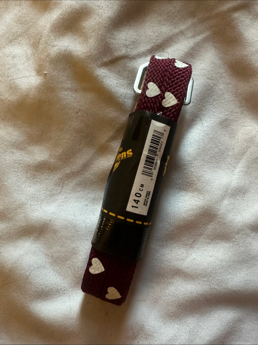 Brand new Dr. Martens shoelaces —burgundy with little white hearts. 140 cm in length. Good for 8 - 10 hole boots.