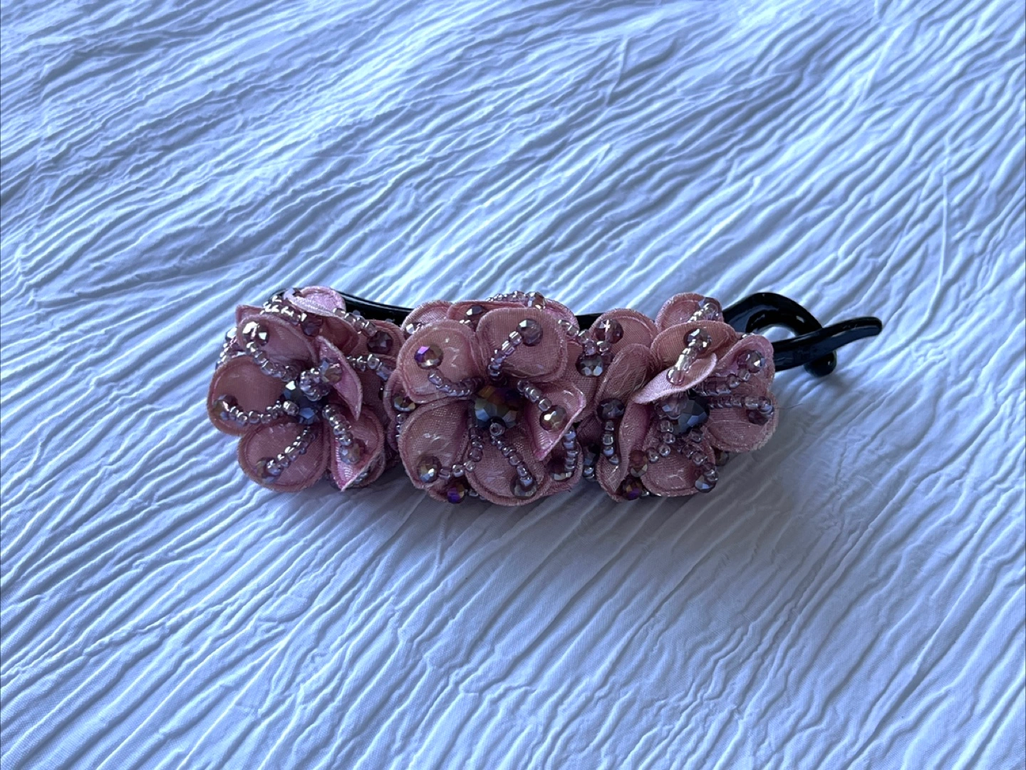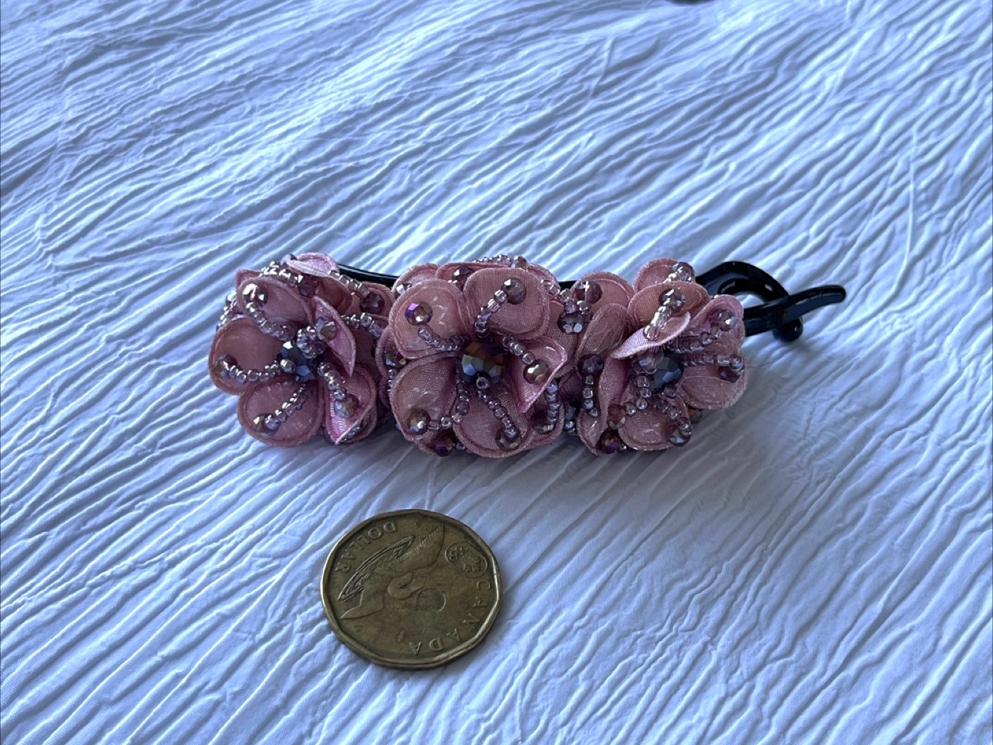 $5 for a pretty floral hair clip in a lovely shade of pink! It's adorned with little beads and has a black clip. Perfect for adding a touch of elegance to your hairstyle